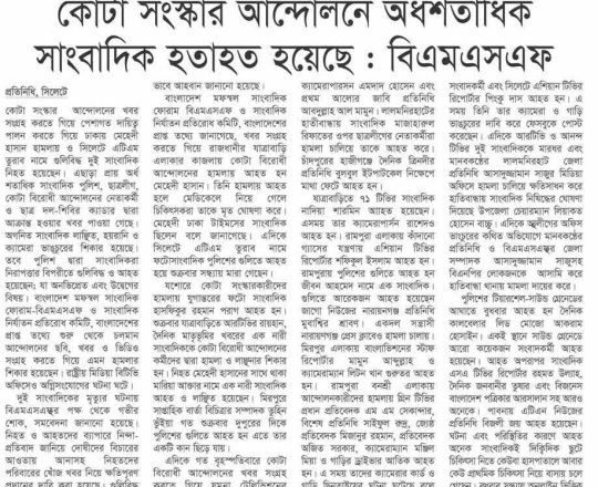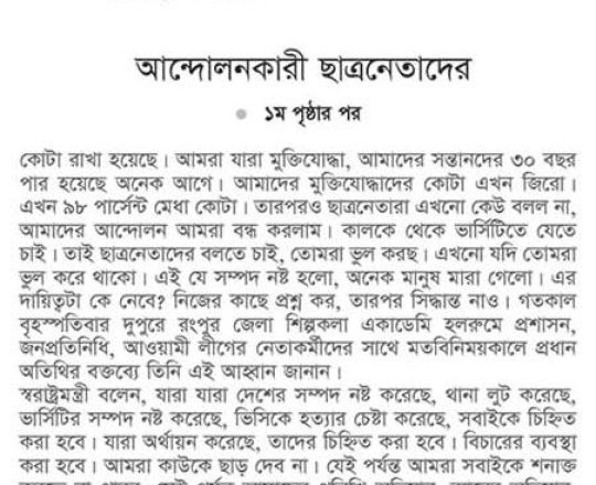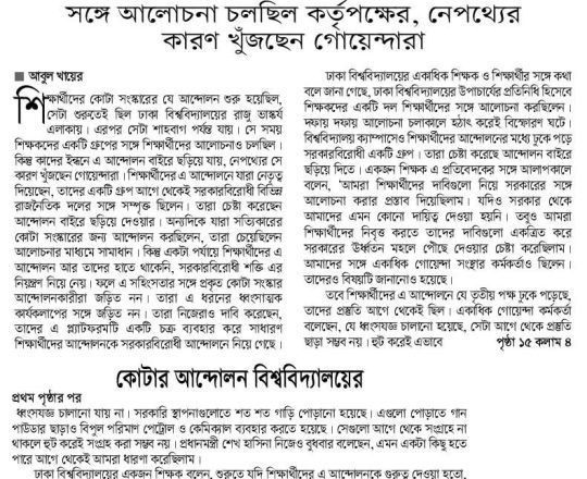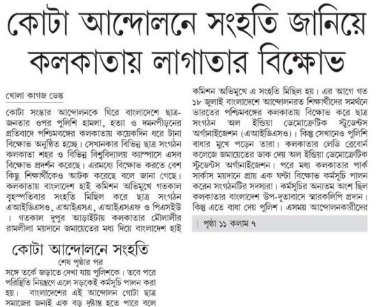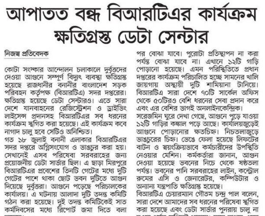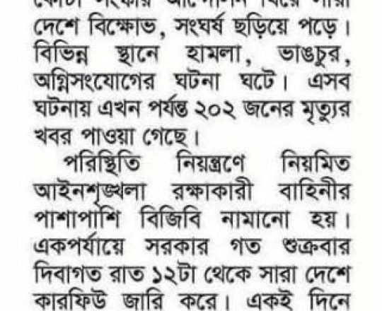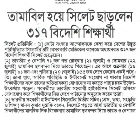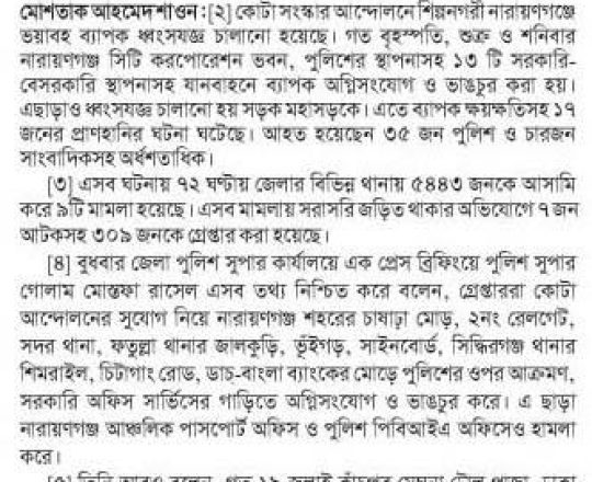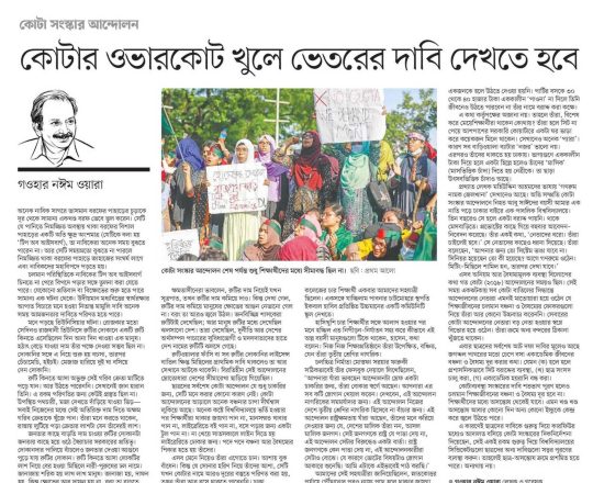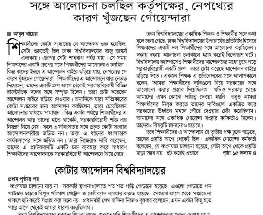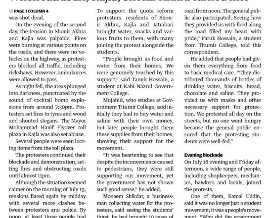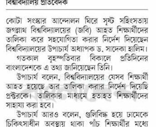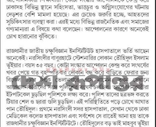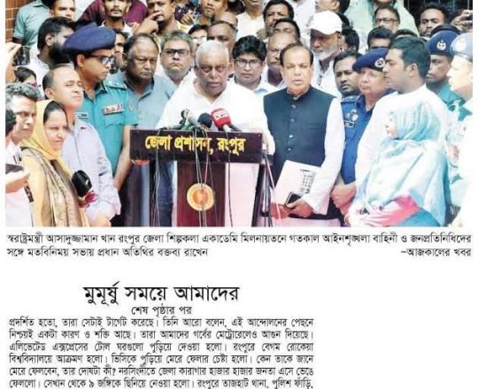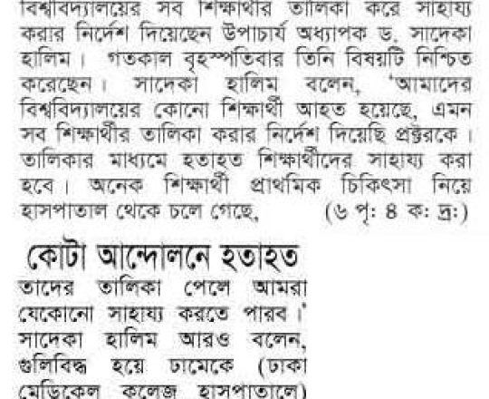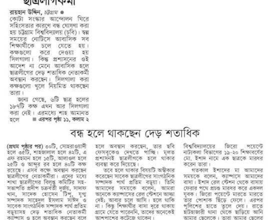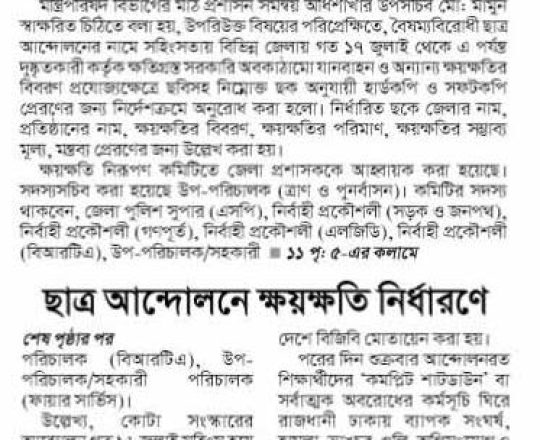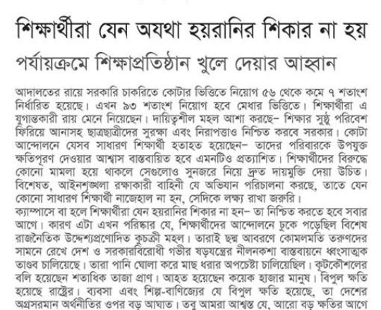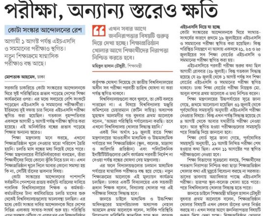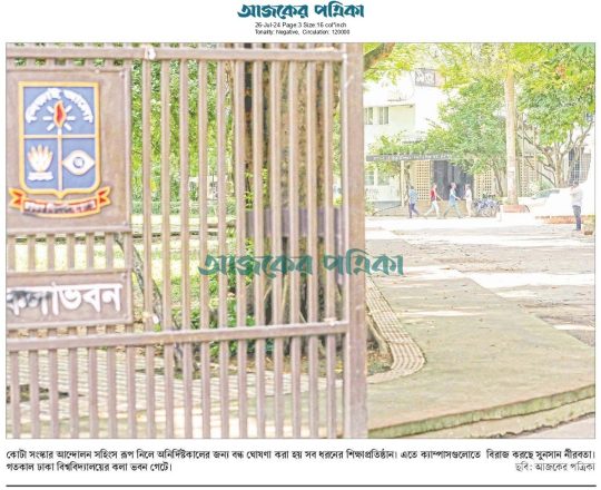আজকের পত্রিকা, ২৬ জুলাই ২০২৪, কোটা সংস্কার আন্দোলন সহিংস রূপ নিলে অনির্দিষ্টকালের জন্য বন্ধ ঘোষণা করা হয় সব ধরনের শিক্ষাপ্রতিষ্ঠান
