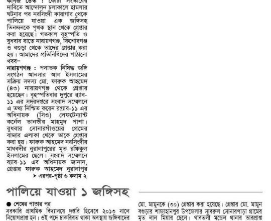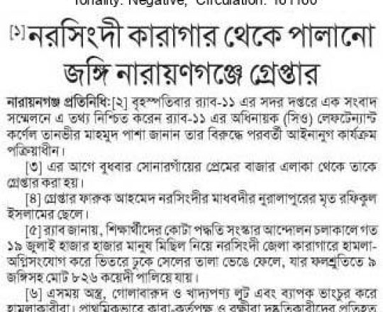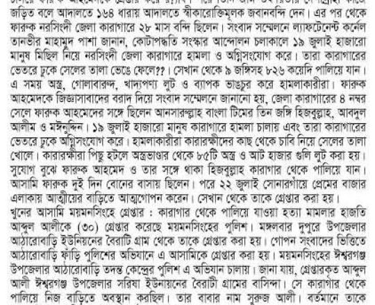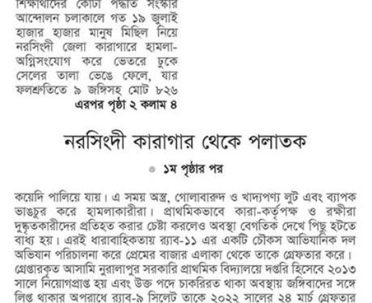 আজকের পত্রিকা, ২৬ জুলাই ২০২৪, নরসিংদী কারাগার থেকে পালানো জঙ্গি গ্রেপ্তার নারায়ণগঞ্জে