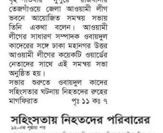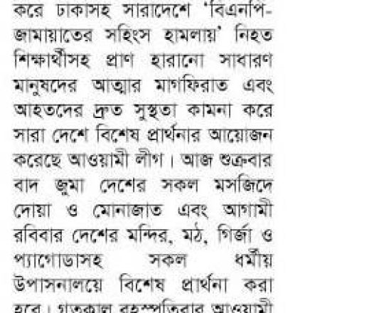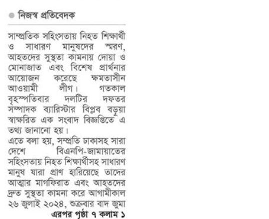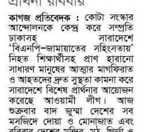 আজকালের খবর, ২৬ জুলাই ২০২৪, সহিংসতায় নিহতদের স্মরণে আওয়ামী লীগের বিশেষ প্রার্থনা আজ