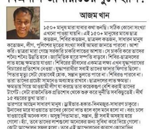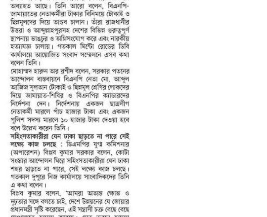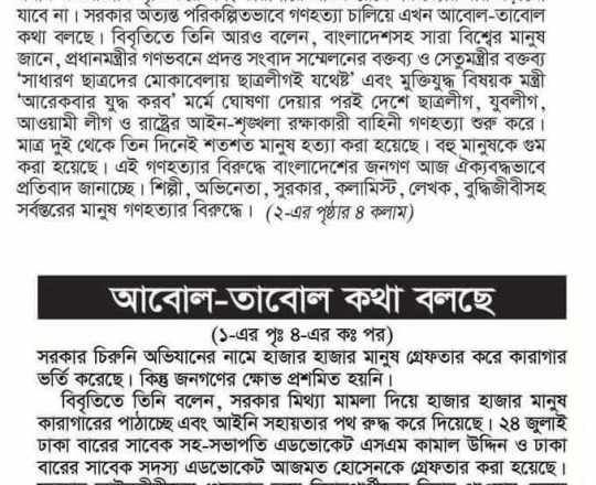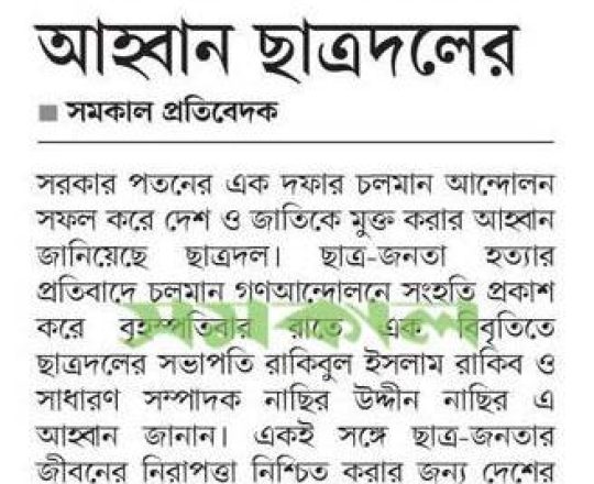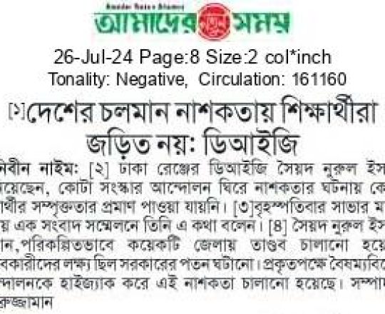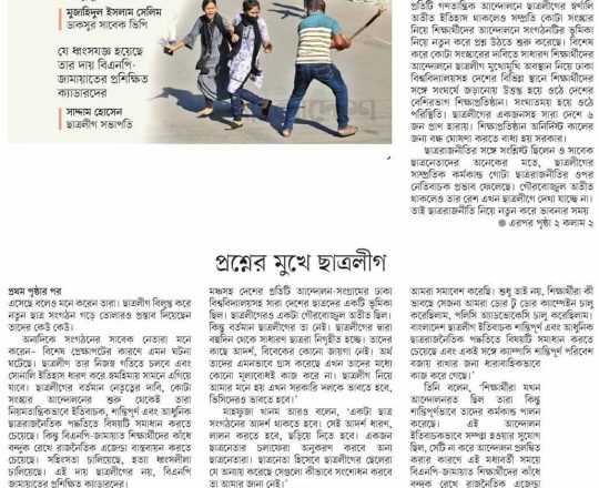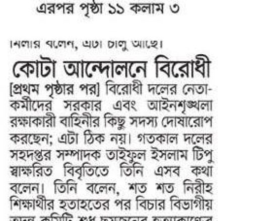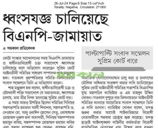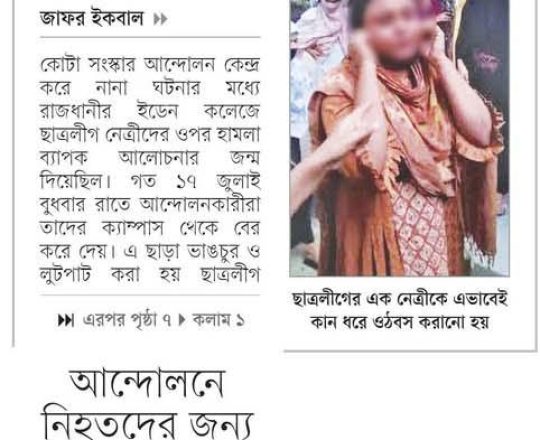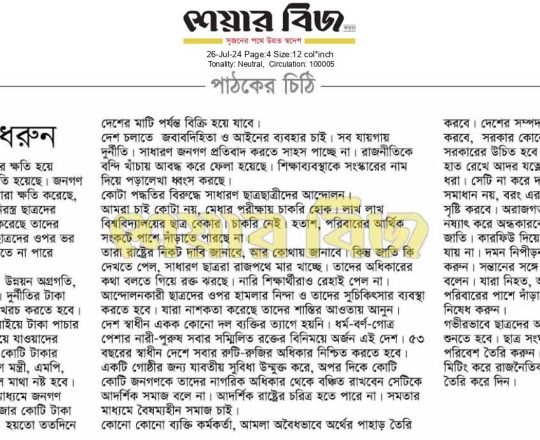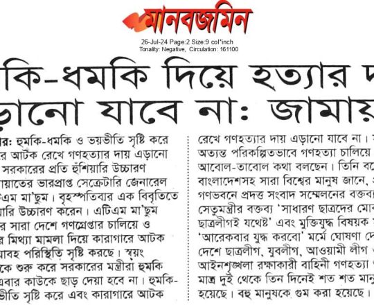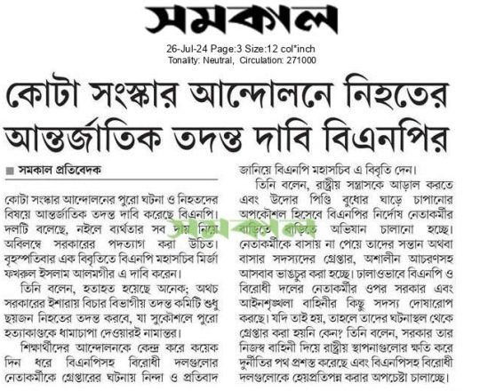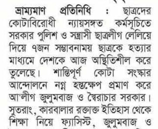 সংগ্রাম, ২৬ জুলাই ২০২৪, সরকার গণহত্যার দায় এড়াতে ছাত্রশিবিরকে জড়িয়ে মিথ্যা প্রোপাগান্ডা ছড়াচ্ছে -ছাত্রশিবির