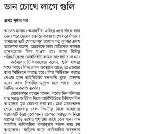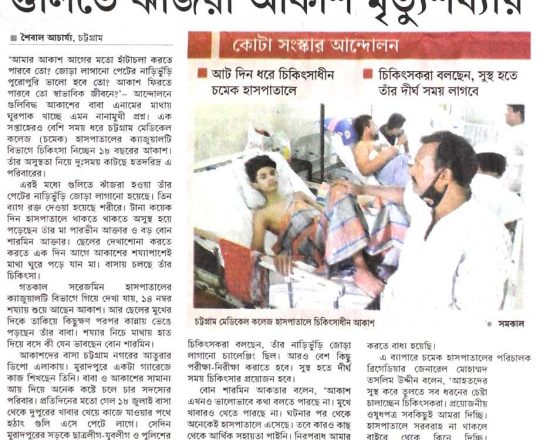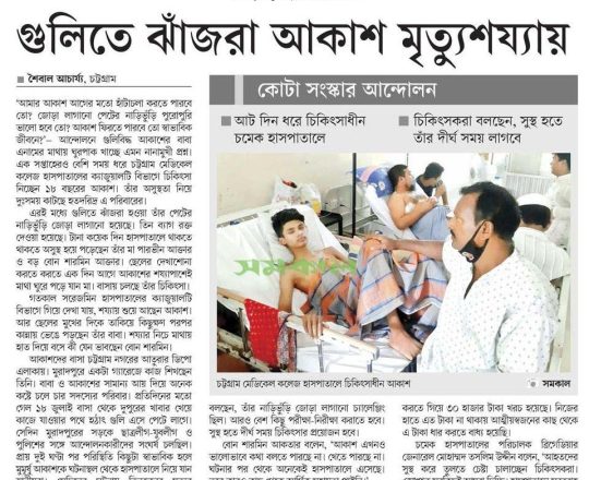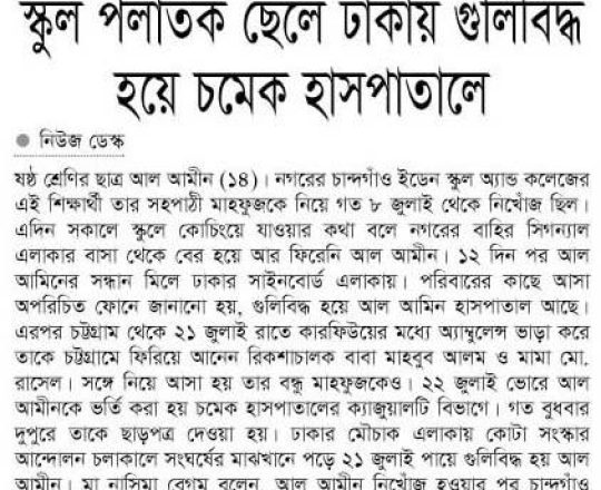 আজকালের খবর, ২৬ জুলাই ২০২৪, স্কুল পলাতক ছেলে ঢাকায় গুলিবিদ্ধ হয়ে চমেক হাসপাতালে
