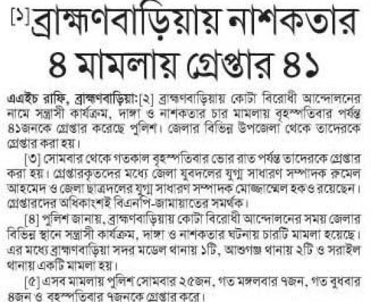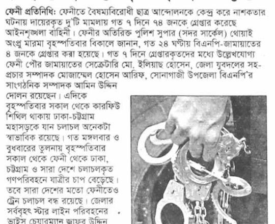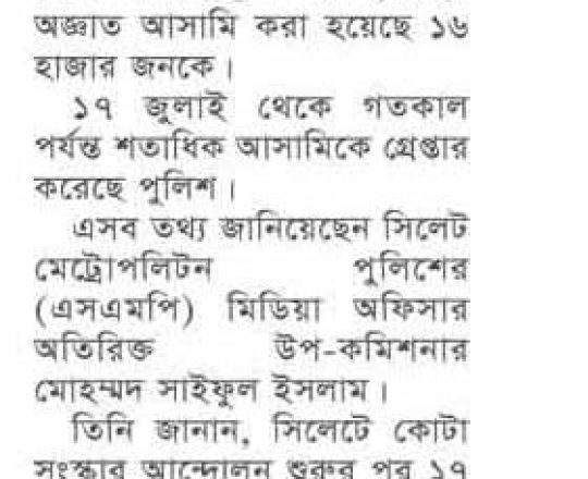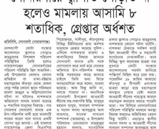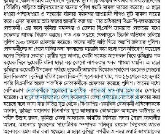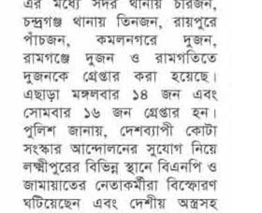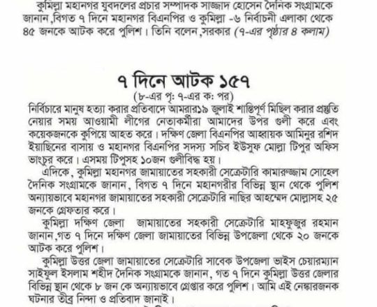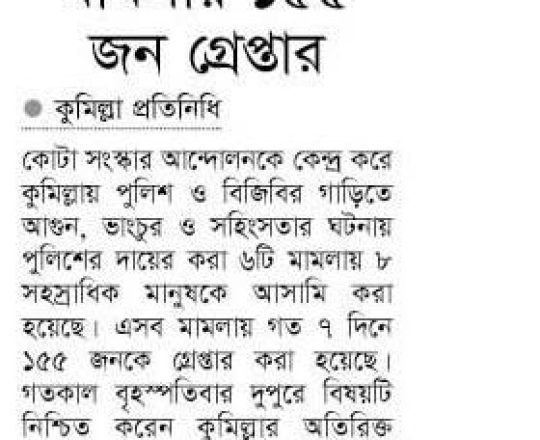 সংগ্রাম, ২৬ জুলাই ২০২৪, কুমিল্লায় ৭ মামলায় আসামী প্রায় ৮ হাজার ৭ দিনে আটক ১৫৭