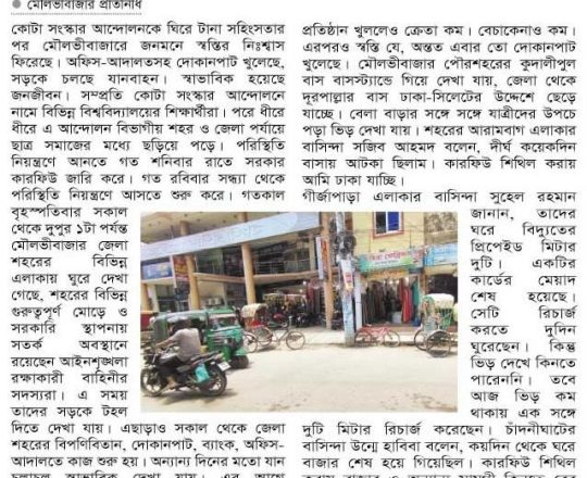 আজকালের খবর, ২৬ জুলাই ২০২৪, মৌলভীবাজারে জনমনে ফিরছে স্বস্তির নিঃশ্বাস