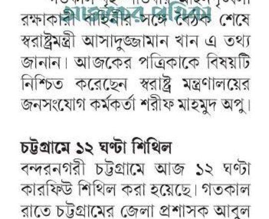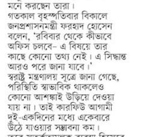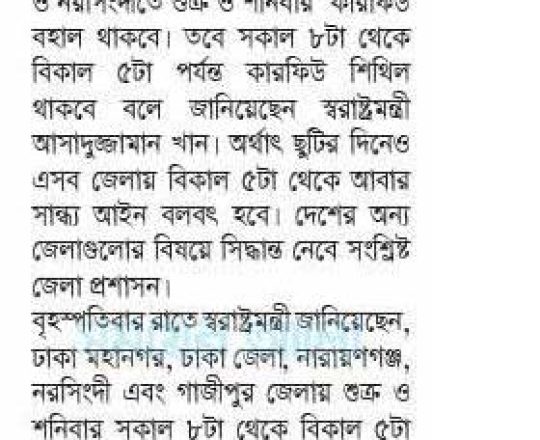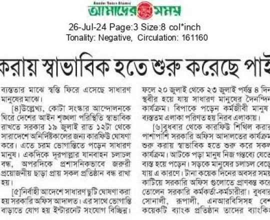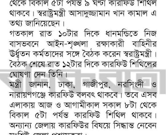 সময়ের আলো, ২৬ জুলাই ২০২৪, আজ সকাল ৮টা থেকে বিকাল ৫টা পর্যন্ত কারফিউ শিথিল