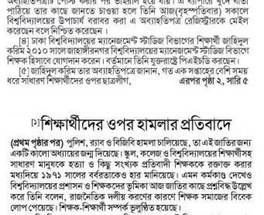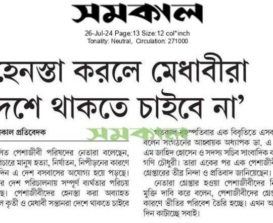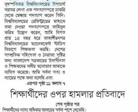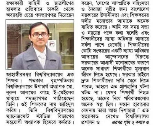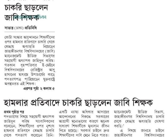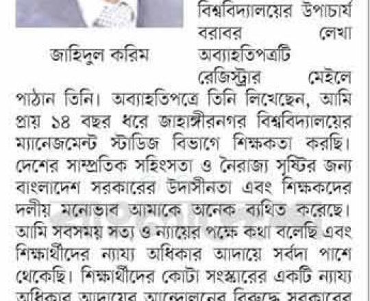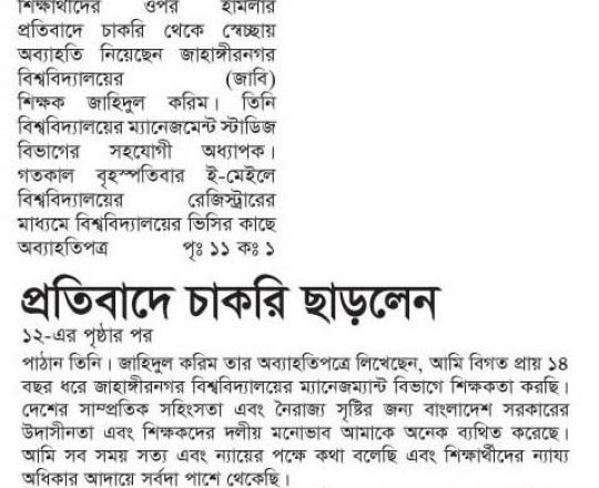 আজকের পত্রিকা, ২৬ জুলাই ২০২৪, হামলার প্রতিবাদে চাকরি ছাড়লেন জাবি শিক্ষক