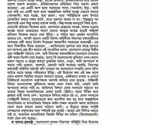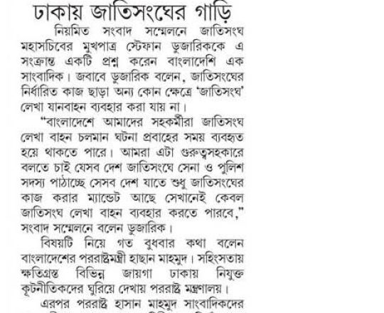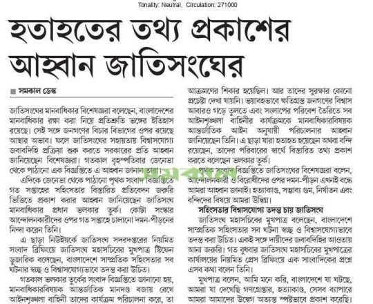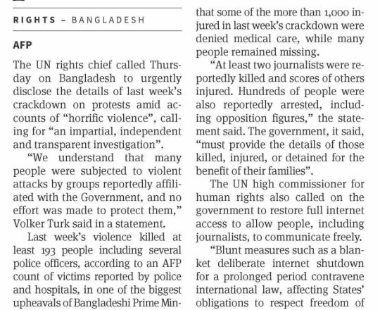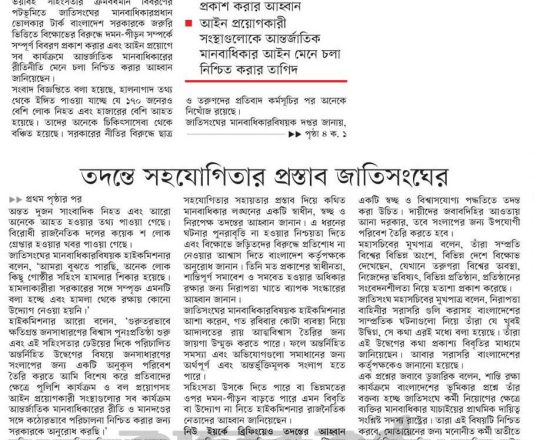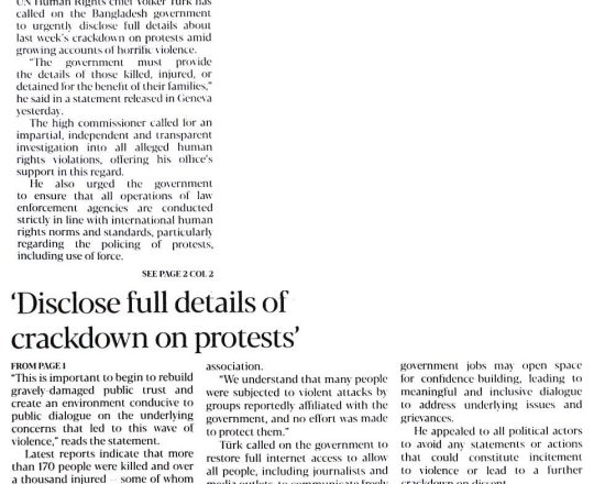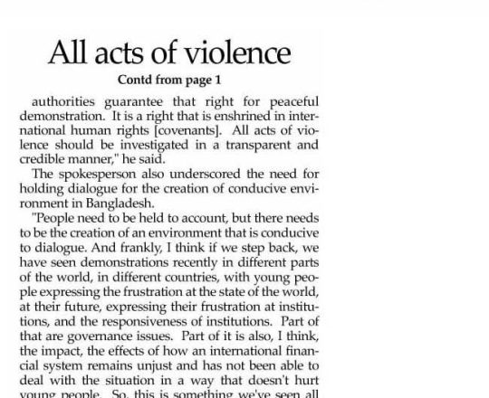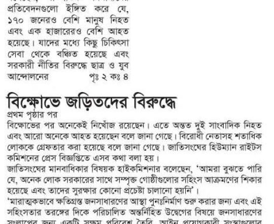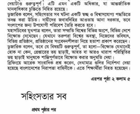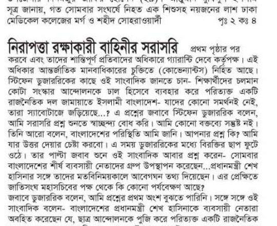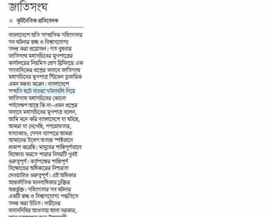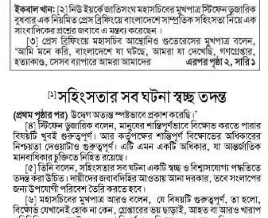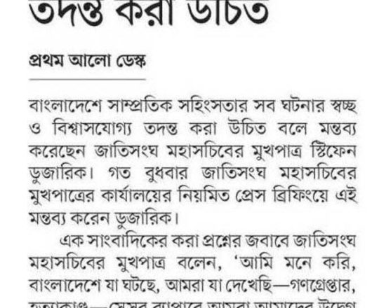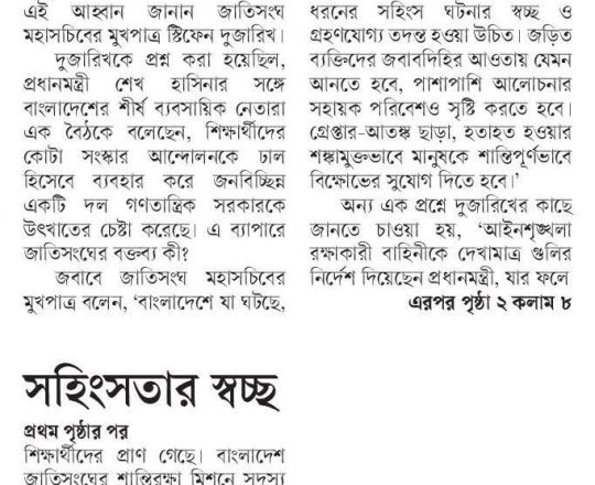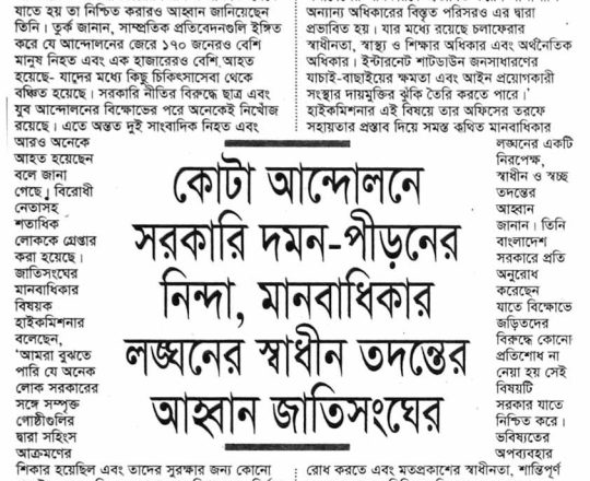 সংগ্রাম, ২৬ জুলাই ২০২৪, বাংলাদেশে সহিংসতার সব ঘটনার স্বচ্ছ ও বিশ্বাসযোগ্য তদন্ত চায় জাতিসংঘ