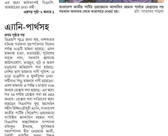 আজকের পত্রিকা, ২৬ জুলাই ২০২৪, এ্যানি-পার্থসহ গ্রেপ্তার আরও ৭৪৩ জন