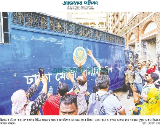 আজকের পত্রিকা, ২৬ জুলাই ২০২৪, সহিংসতার ঘটনায় করা নাশকতাসহ বিভিন্ন মামলায় গ্রেপ্তার আসামিদের আদালত থেকে প্রিজন ভ্যানে করে কারাগারে নেওয়া হয়