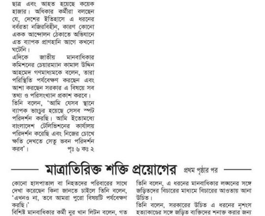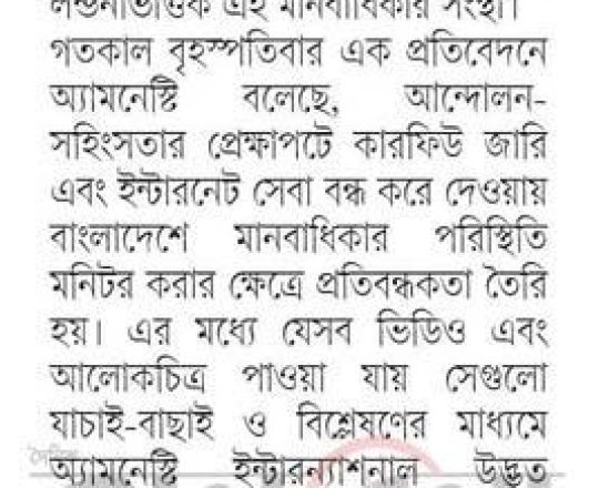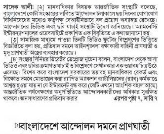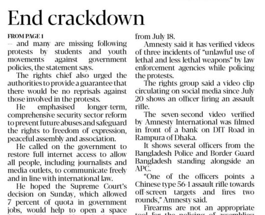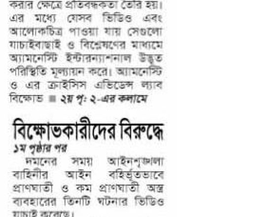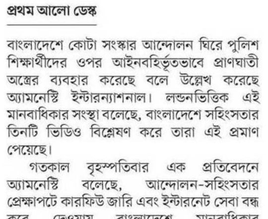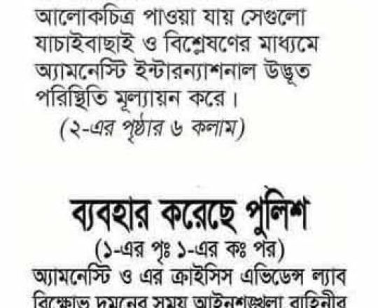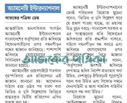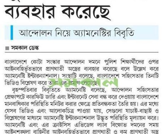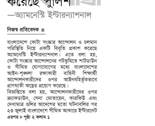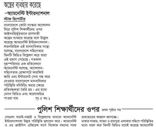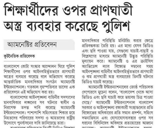 সংগ্রাম, ২৬ জুলাই ২০২৪, অ্যামনেস্টি ইন্টারন্যাশনাল বিক্ষোভকারীদের বিরুদ্ধে প্রাণঘাতী অস্ত্র ব্যবহার করেছে পুলিশ