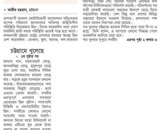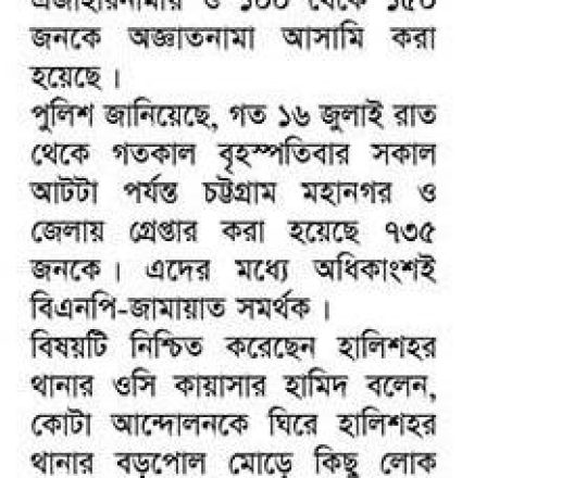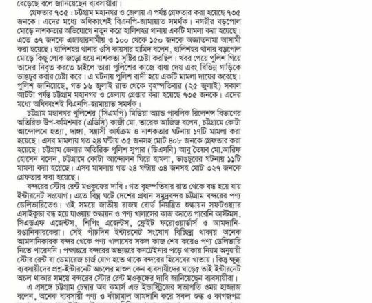 প্রথম আলো, ২৬ জুলাই ২০২৪, চট্টগ্রামে ১০ দিনেই ৮০০ ছাড়াল গ্রেপ্তার