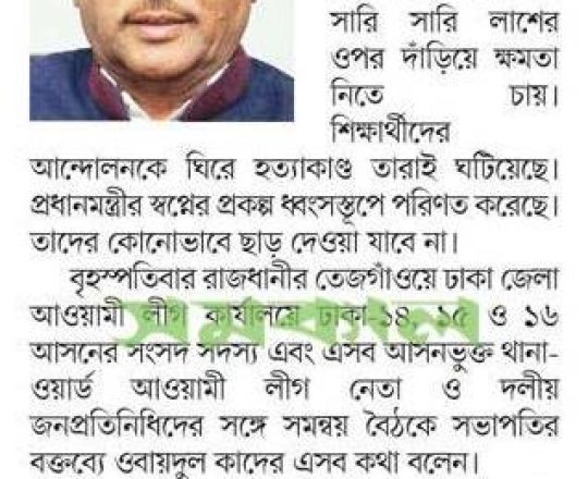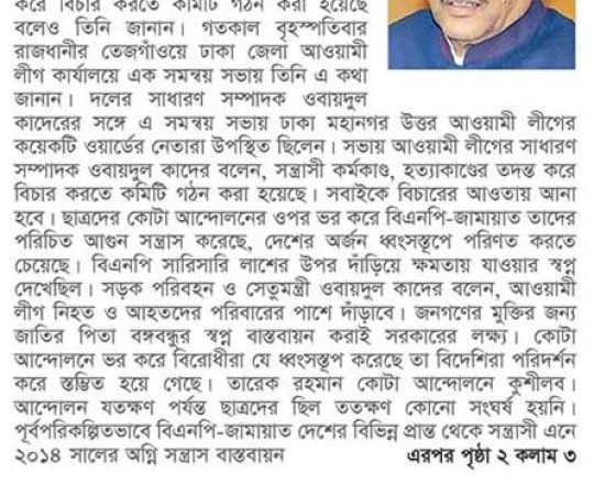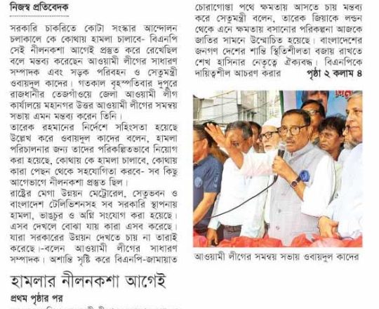 আজকের পত্রিকা, ২৬ জুলাই ২০২৪, আরও খারাপ পরিস্থিতির আশঙ্কা ওবায়দুল কাদেরের
