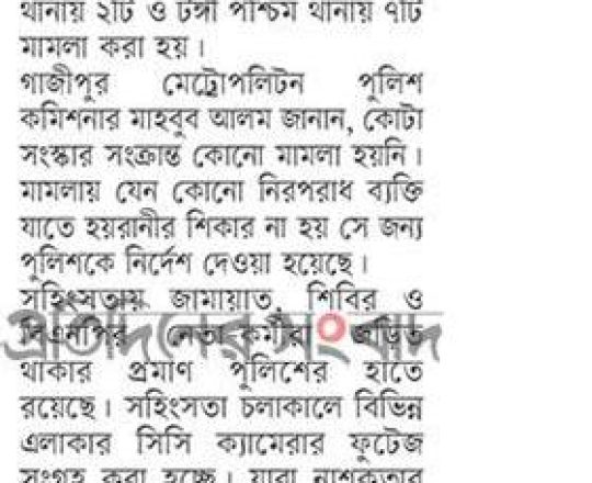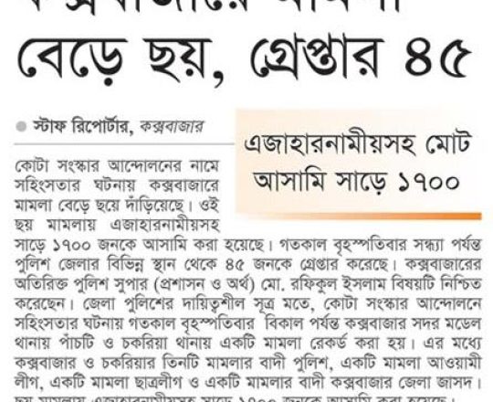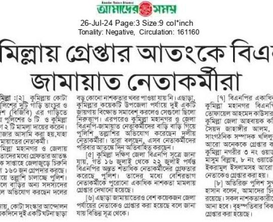 আজকালের খবর, ২৬ জুলাই ২০২৪, কুমিল্লায় ৬ মামলায় ১৫৫ জন গ্রেপ্তার