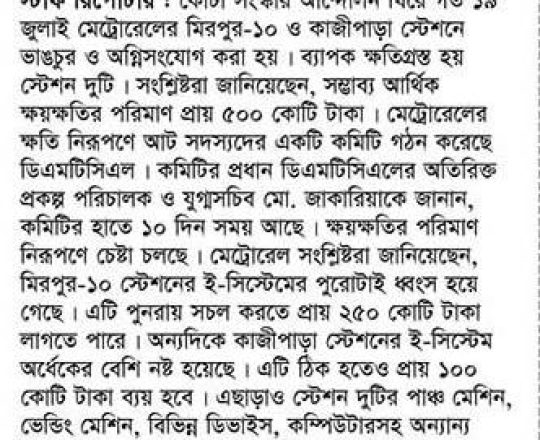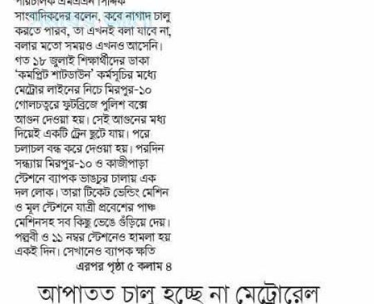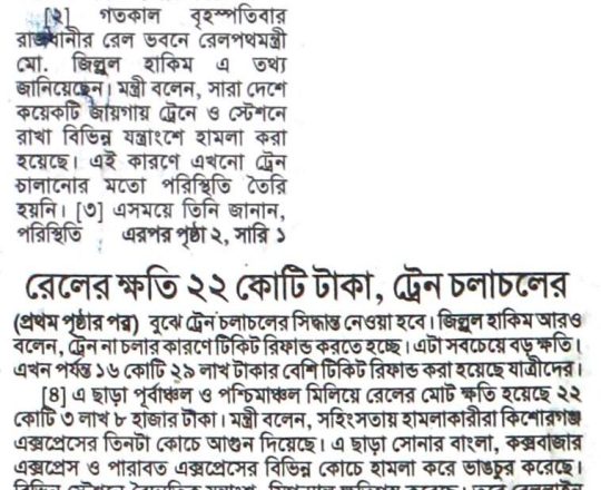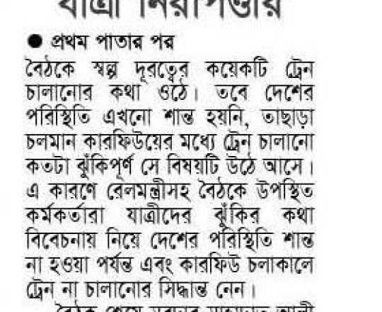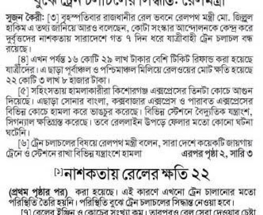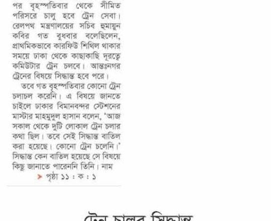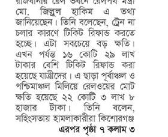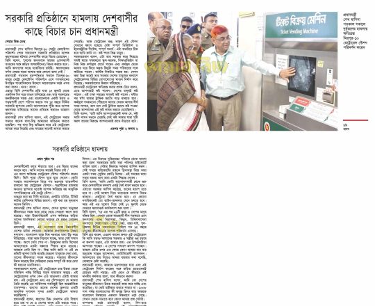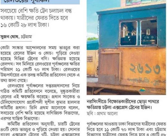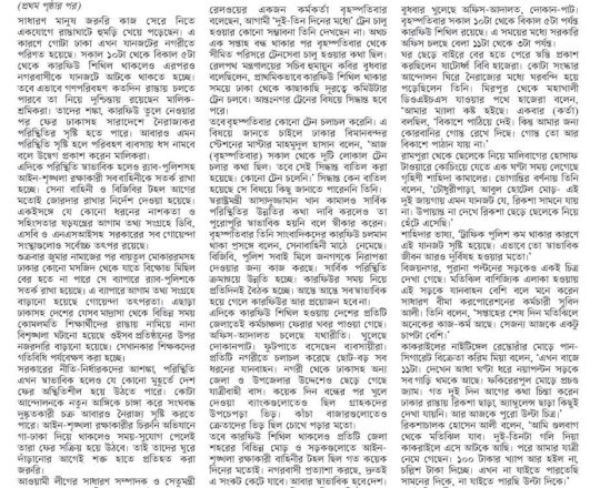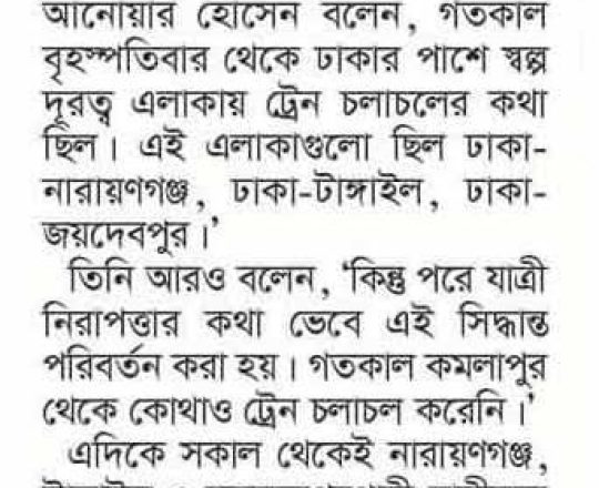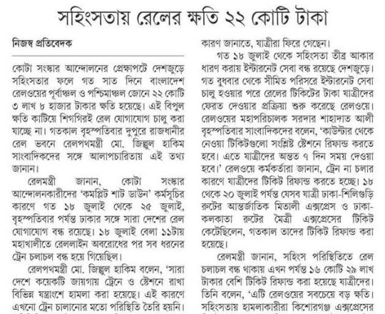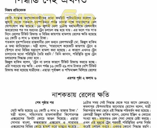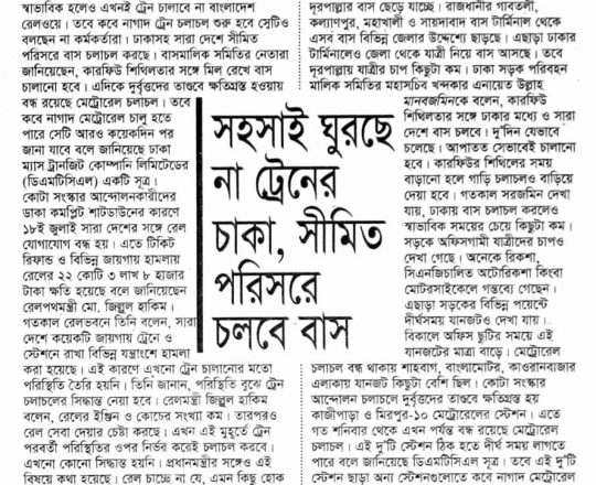 সংগ্রাম, ২৬ জুলাই ২০২৪, যাত্রী নিরাপত্তার কথা চিন্তা করে আবারও ট্রেন চলাচল বাতিল