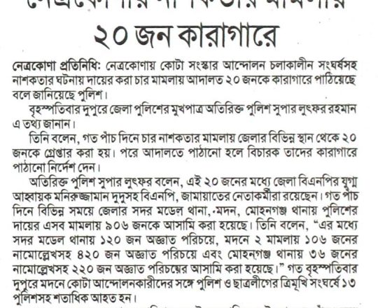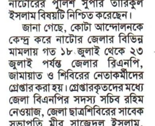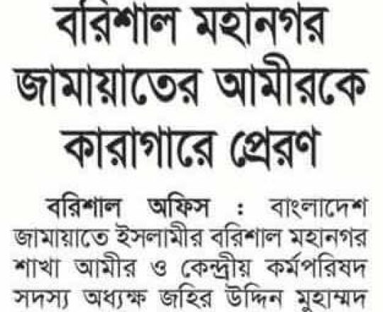 সংগ্রাম, ২৬ জুলাই ২০২৪, বরিশাল মহানগর জামায়াতের আমীরকে কারাগারে প্রেরণ