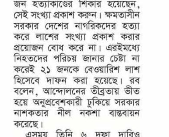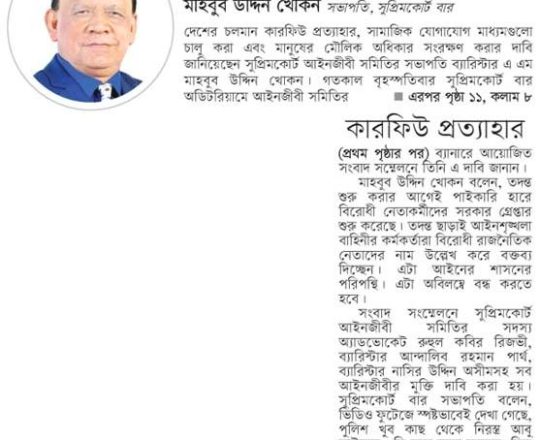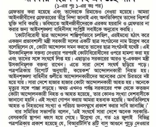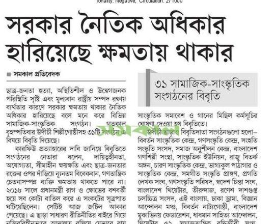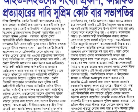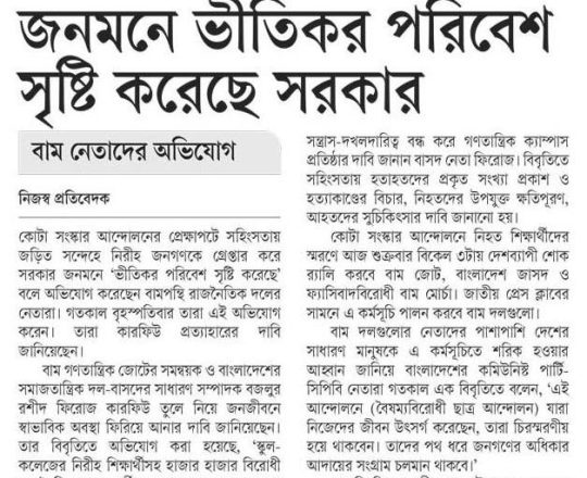 সংগ্রাম, ২৬ জুলাই ২০২৪, কারফিউ প্রত্যাহার ও মানুষের মৌলিক অধিকার সংরক্ষণসহ একগুচ্ছ দাবি