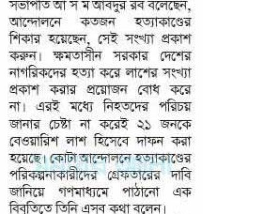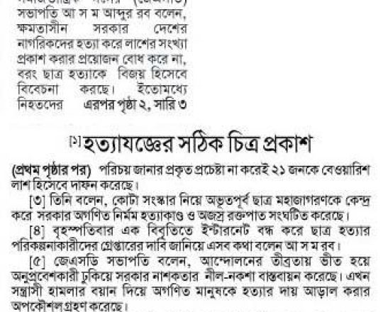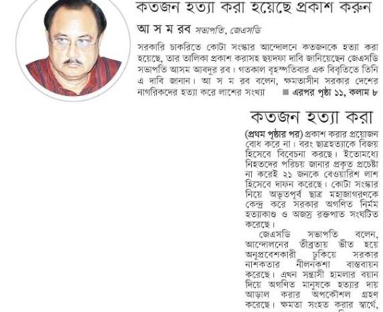 সংগ্রাম, ২৬ জুলাই ২০২৪, আন্দোলনে কত জন হত্যাকাণ্ডের শিকার সেই সংখ্যা প্রকাশ করুন -আসম রব
