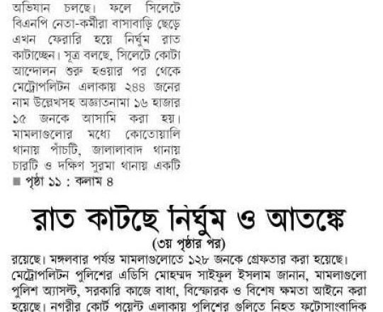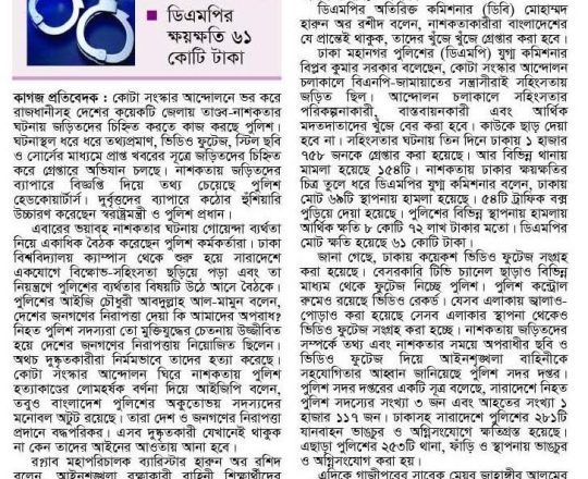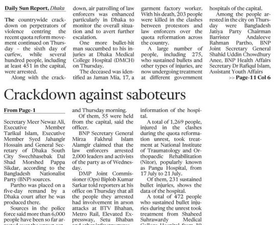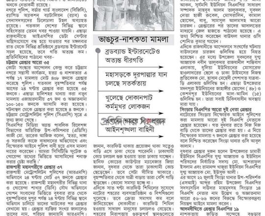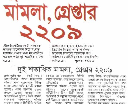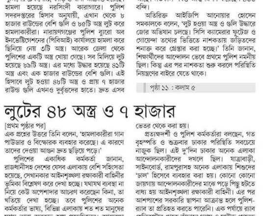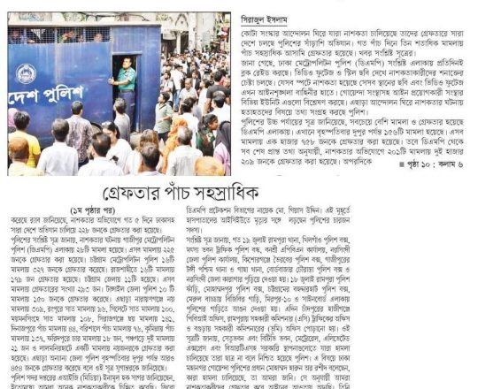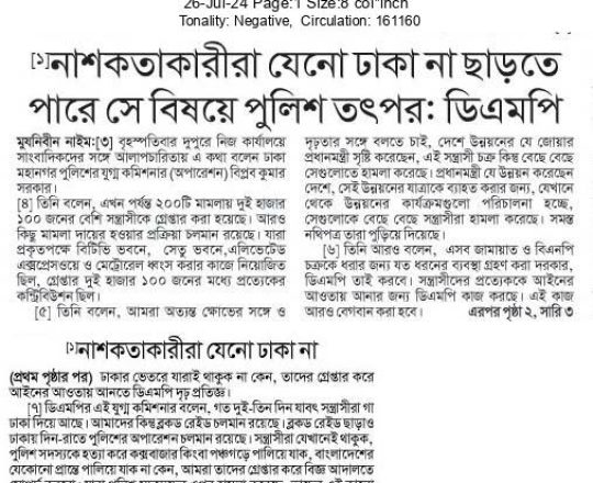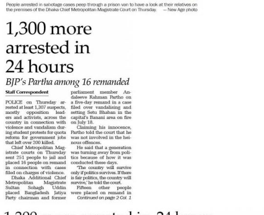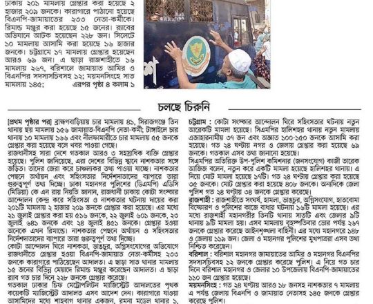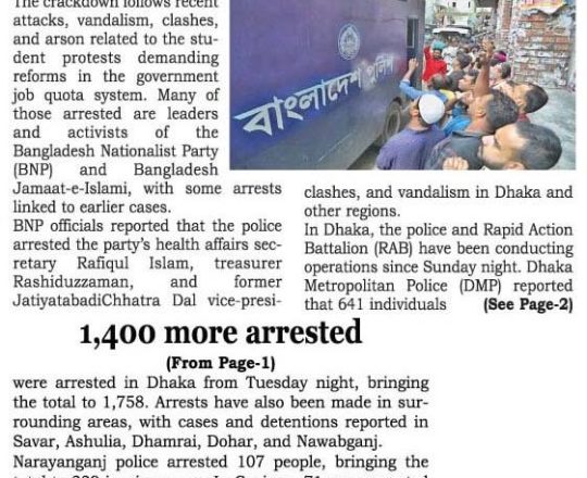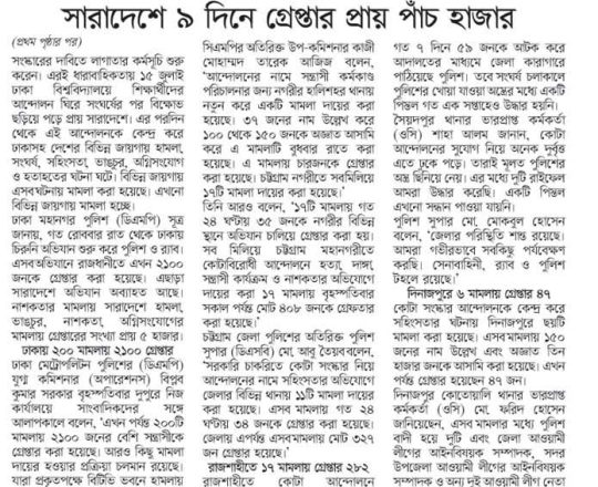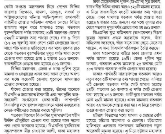 প্রথম আলো, ২৬ জুলাই ২০২৪, সারা দেশে অভিযানে গ্রেপ্তার আরও ১৪০০, ৮ দিনে প্রায় ৪৫০০