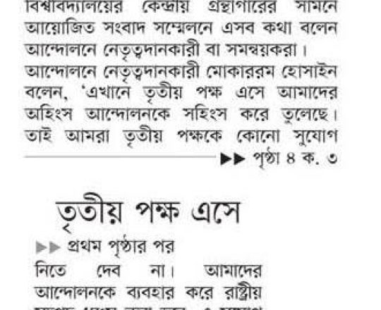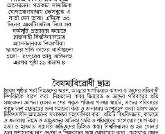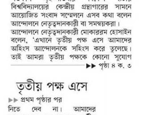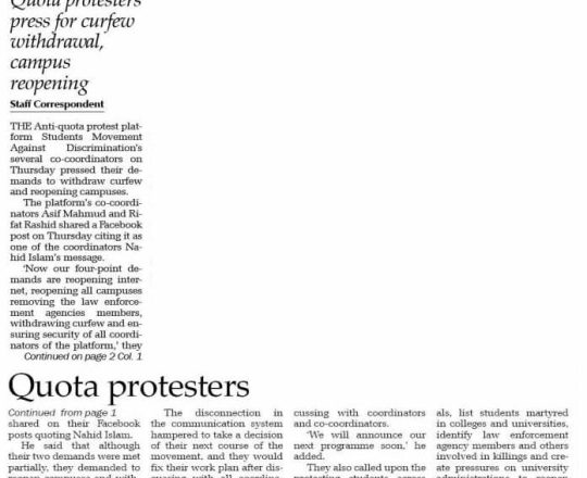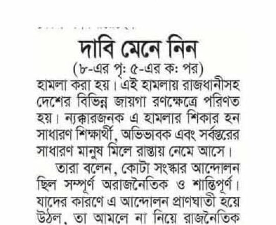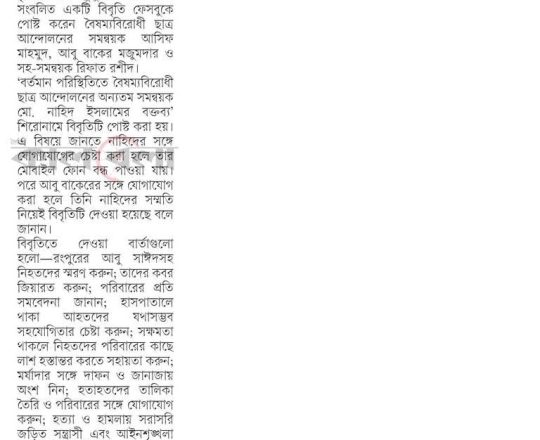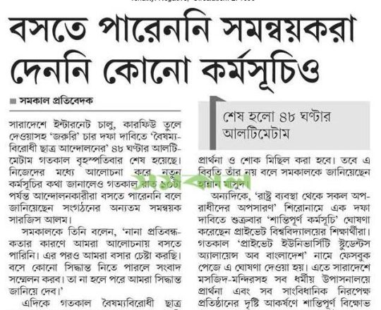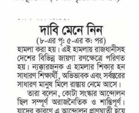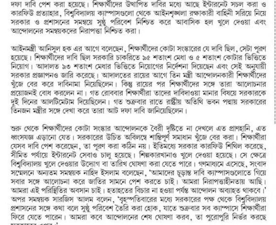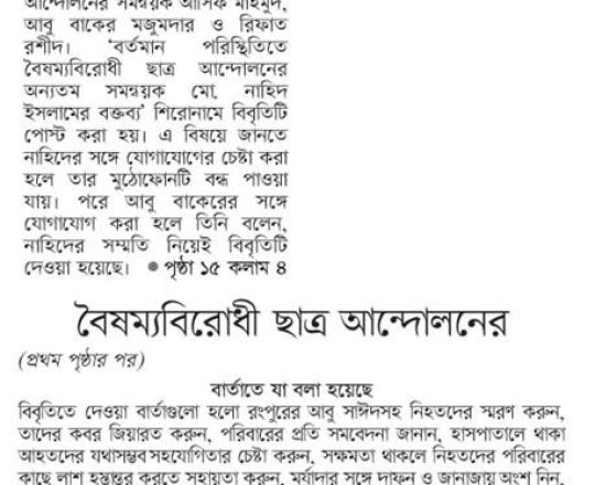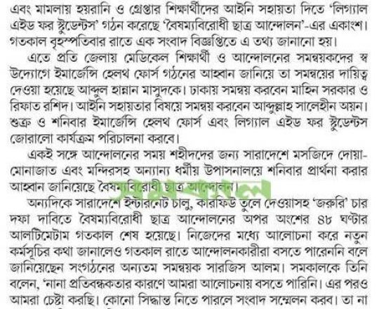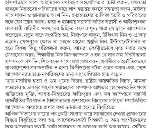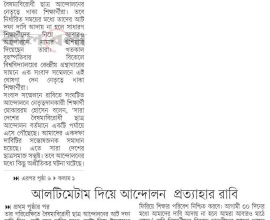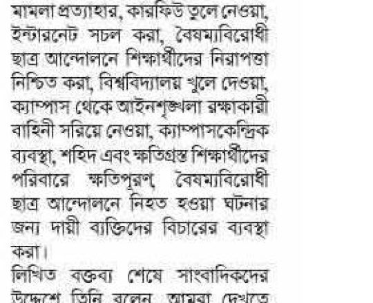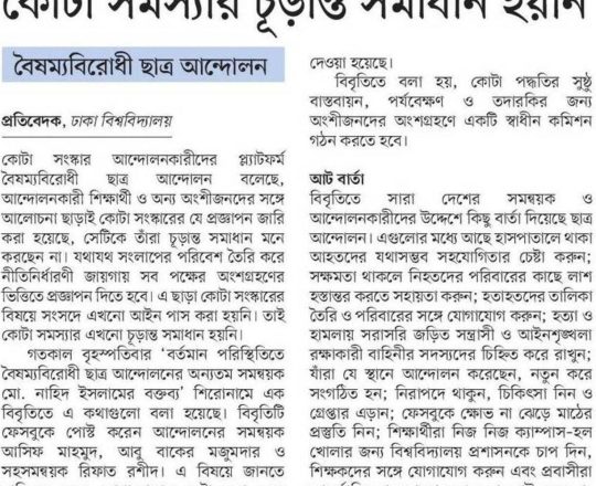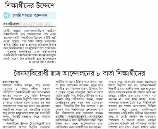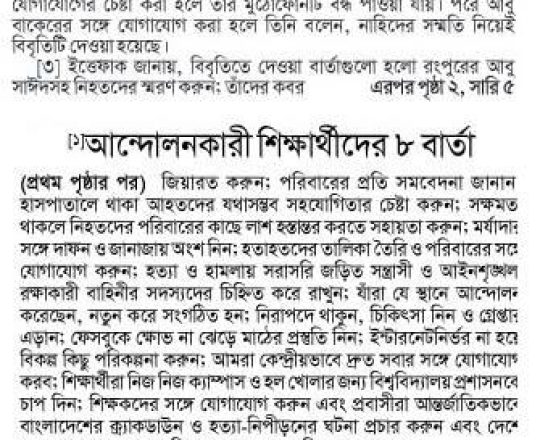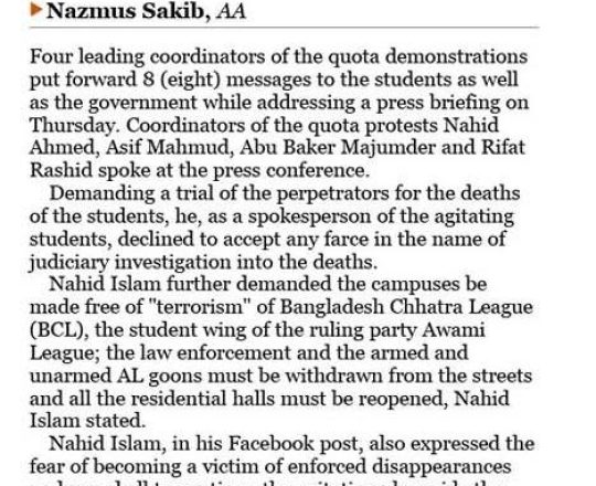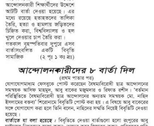 প্রথম আলো, ২৬ জুলাই ২০২৪, আন্দোলনকারী শিক্ষার্থীদের ৮ বার্তা দিল বৈষম্যবিরোধী ছাত্র আন্দোলন
