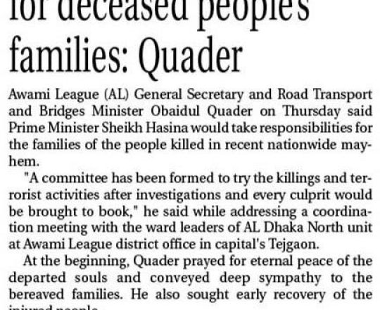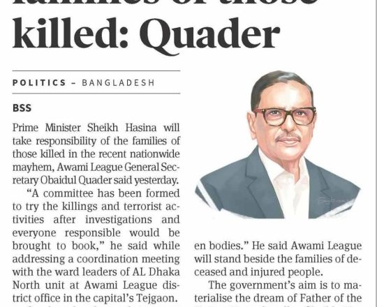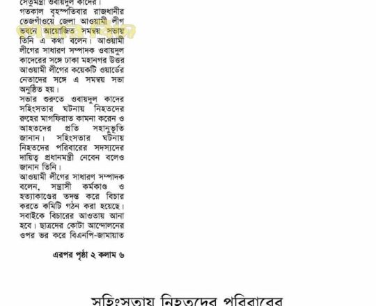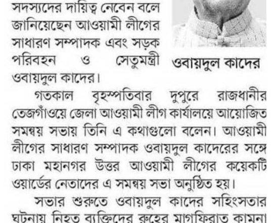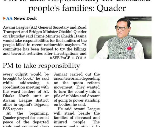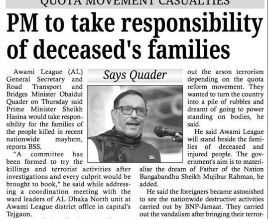 শেয়ার বিজ, ২৬ জুলাই ২০২৪, সহিংসতায় নিহতদের পরিবারের দায়িত্ব নেবেন প্রধানমন্ত্রী -ওবায়দুল কাদের