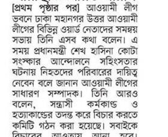 আজকালের খবর, ২৬ জুলাই ২০২৪, ক্ষতিগ্রস্ত পরিবারগুলোর দায়িত্ব নেবেন প্রধানমন্ত্রী -ওবায়দুল কাদের