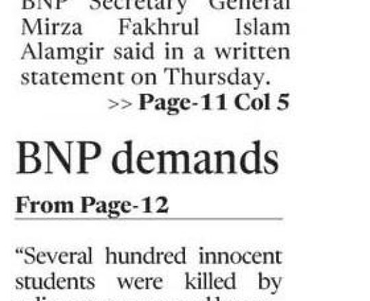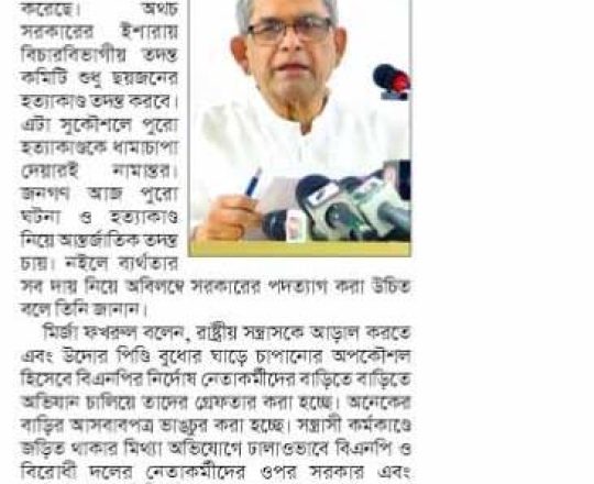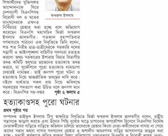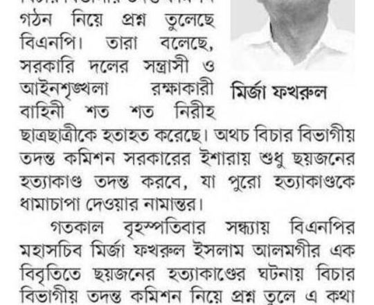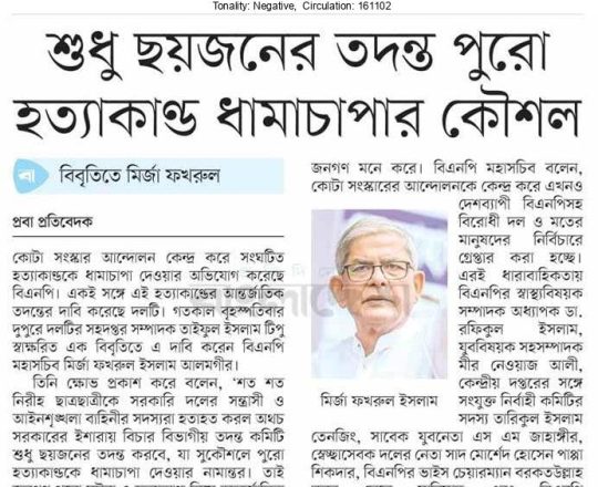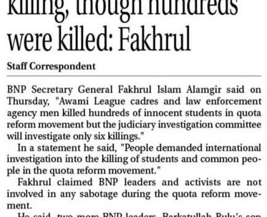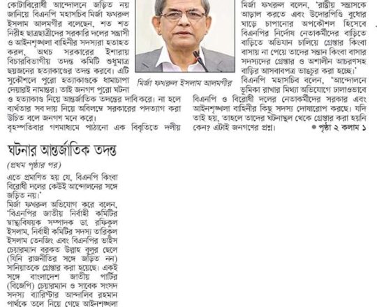 আজকের পত্রিকা, ২৬ জুলাই ২০২৪, সরকারই রাষ্ট্রীয় স্থাপনার ক্ষতি করেছে: ফখরুল