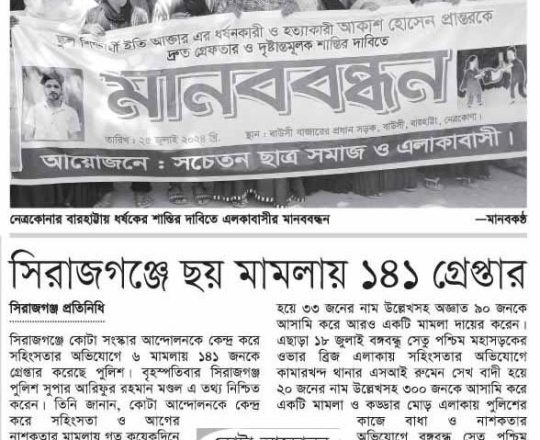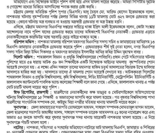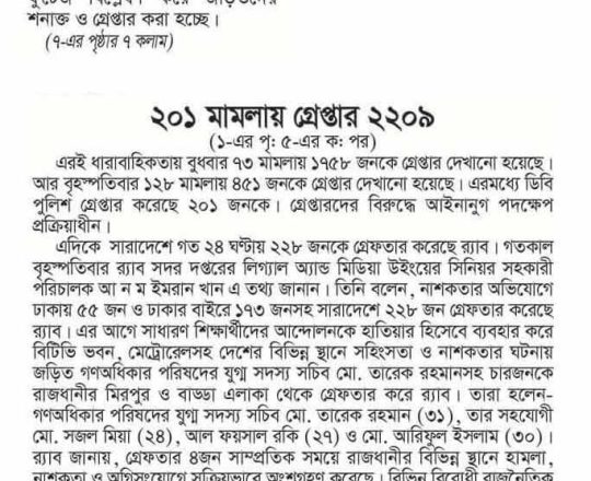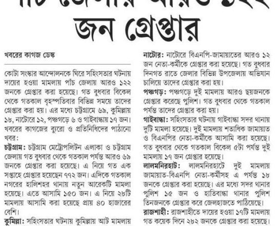 সময়ের আলো, ২৬ জুলাই ২০২৪, দেশের বিভিন্ন জেলায় গ্রেফতার ২৯২