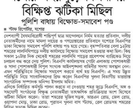 আজকের পত্রিকা, ২৬ জুলাই ২০২৪, বিএনপির বিক্ষোভপুলিশি বাধায় পণ্ড