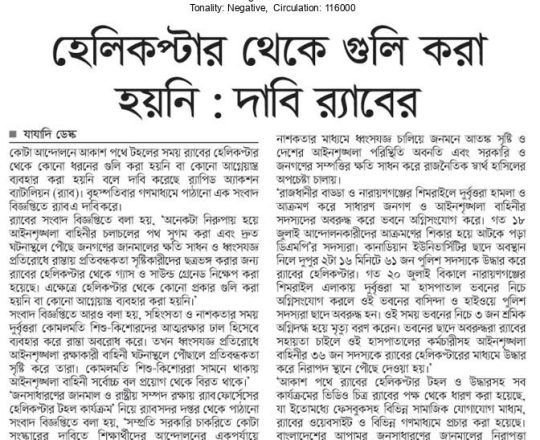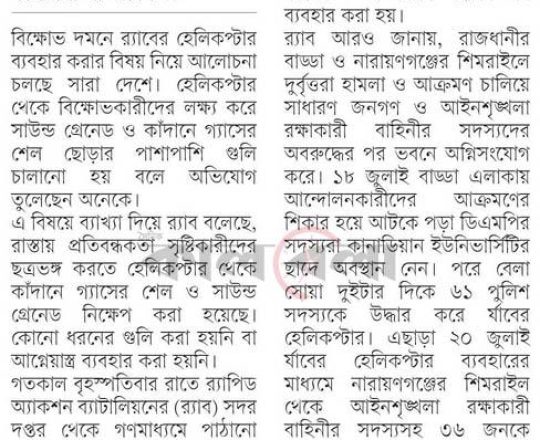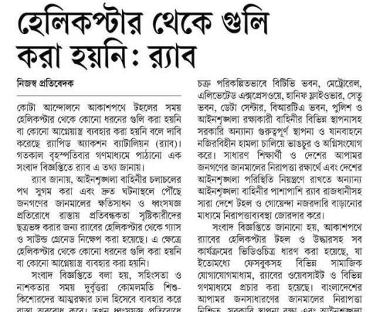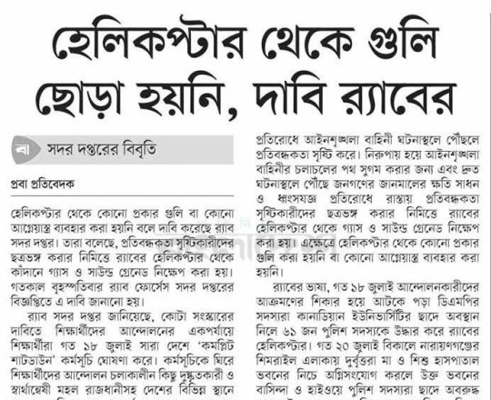 আজকের পত্রিকা, ২৬ জুলাই ২০২৪, হেলিকপ্টার থেকে গুলি নয়, গ্যাস ও সাউন্ড গ্রেনেড ছোড়া হয়: র‍্যাব