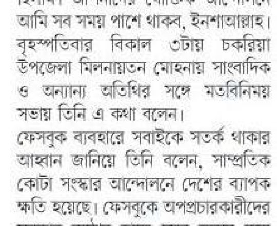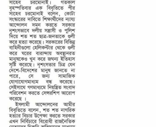 সংগ্রাম, ২৬ জুলাই ২০২৪, ছাত্রসমাজের দাবি মেনে নিয়ে দেশে শান্তির পরিবেশ ফিরিয়ে আনুন -পীর সাহেব চরমোনাই