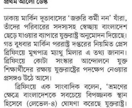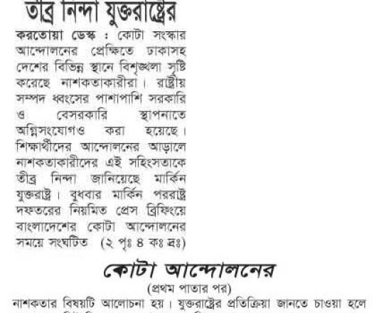 আজকের পত্রিকা, ২৬ জুলাই ২০২৪, ফের সহিংসতার নিন্দা জানাল যুক্তরাষ্ট্র