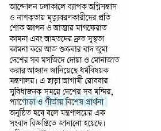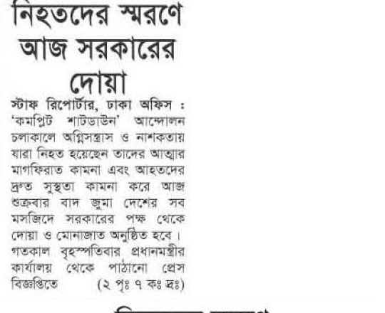 সময়ের আলো, ২৬ জুলাই ২০২৪, সহিংসতায় নিহতদের স্মরণে আজ সব মসজিদে দোয়া ও মোনাজাত
