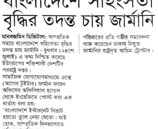 আজকের পত্রিকা, ২৬ জুলাই ২০২৪, সহিংসতার তদন্ত চায় জার্মানি
