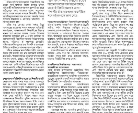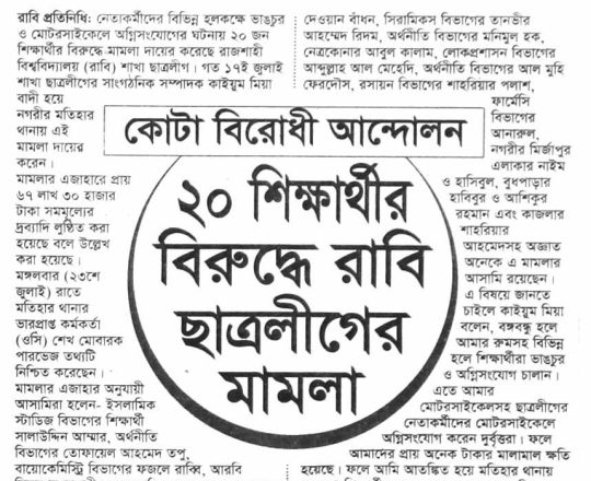 শেয়ার বিজ, ২৬ জুলাই ২০২৪, কোটা সমন্বয়কারীসহ ১৫ শিক্ষার্থীর বিরুদ্ধে রাবি ছাত্রলীগের মামলা