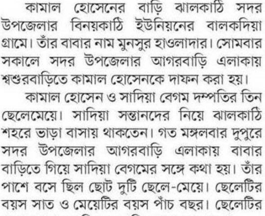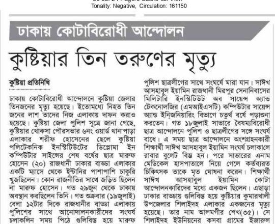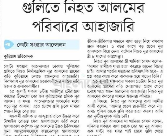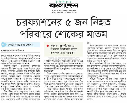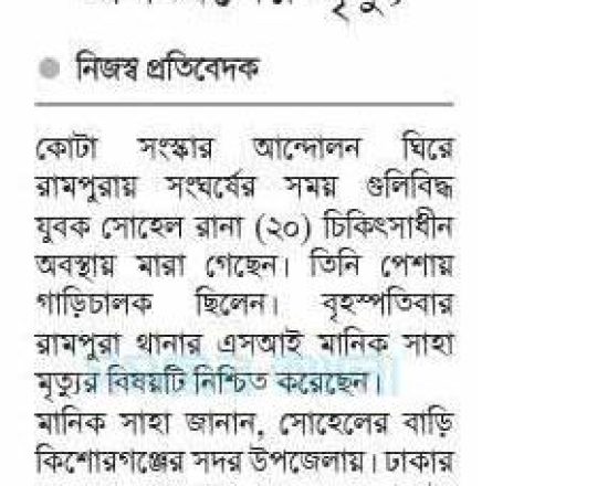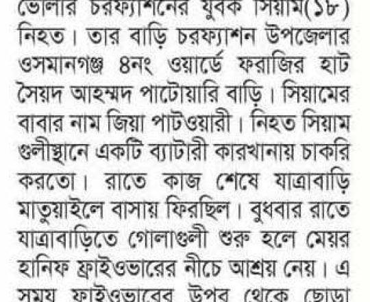 সংগ্রাম, ২৬ জুলাই ২০২৪, কোটা আন্দোলনে ঢাকায় চরফ্যাশনের এক যুবক নিহত
