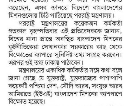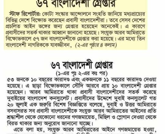 সংগ্রাম, ২৬ জুলাই ২০২৪, সতর্ক থাকার আহ্বান আমিরাত ও সৌদীতে বিক্ষোভকালে ৬৭ বাংলাদেশী গ্রেপ্তার