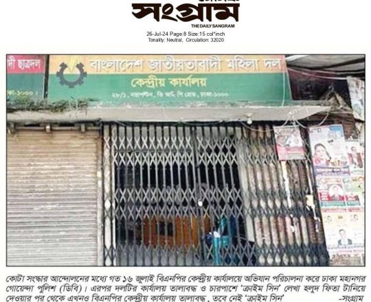 সংগ্রাম, ২৬ জুলাই ২০২৪, বিএনপির কেন্দ্রীয় কার্যালয়ে অভিযান পরিচালনা করে ঢাকা মহানগর গোয়েন্দা পলিশ (ডিবি)
