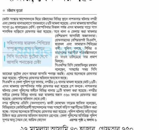 সময়ের আলো, ২৬ জুলাই ২০২৪, ২৭ মামলায় আসামি ৪০ হাজার, গ্রেফতার ৭৫০