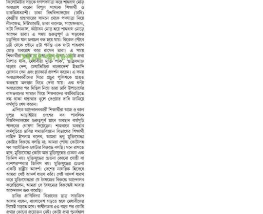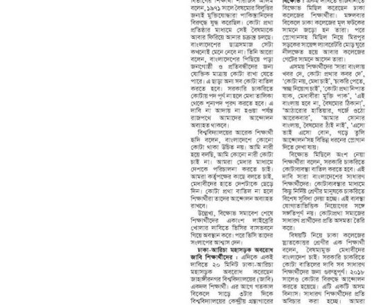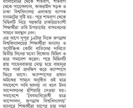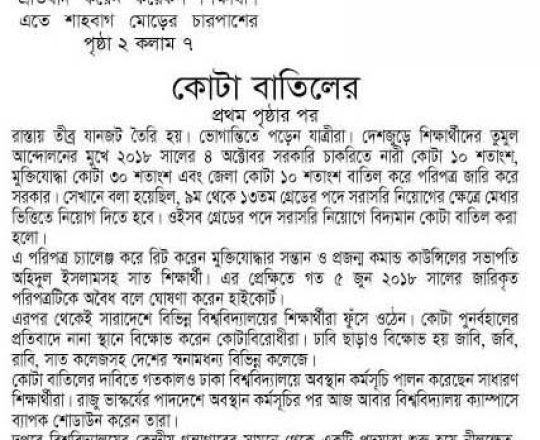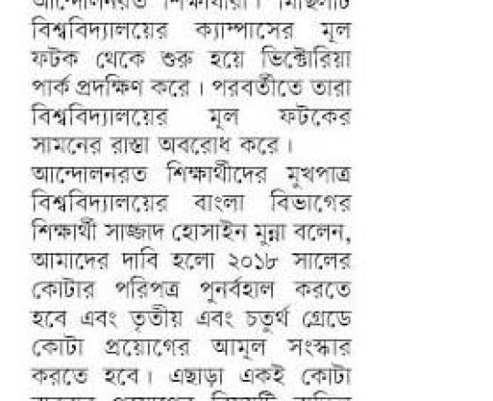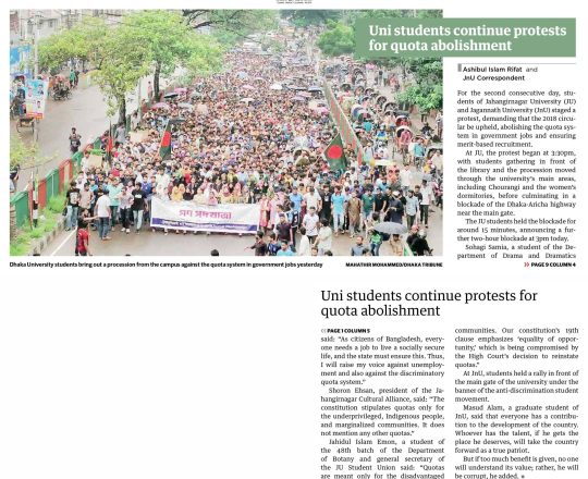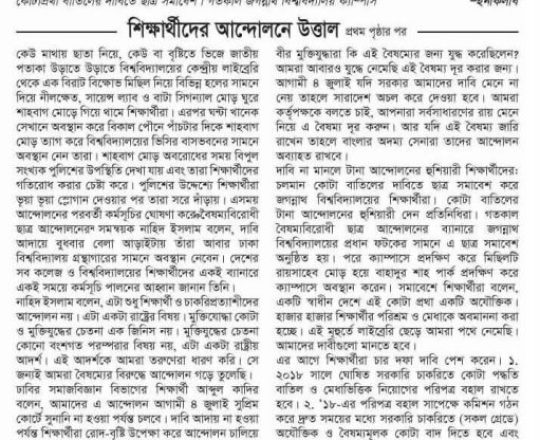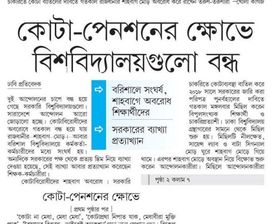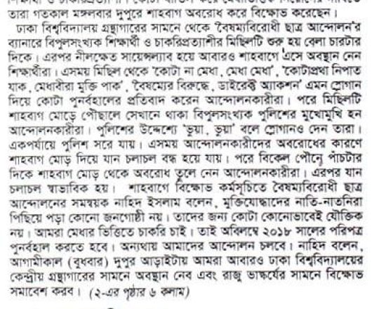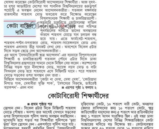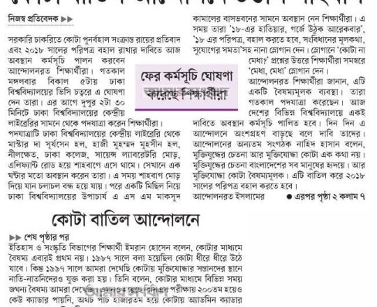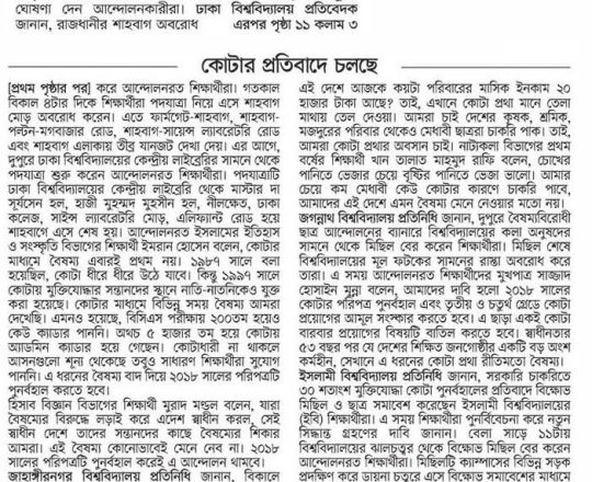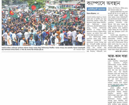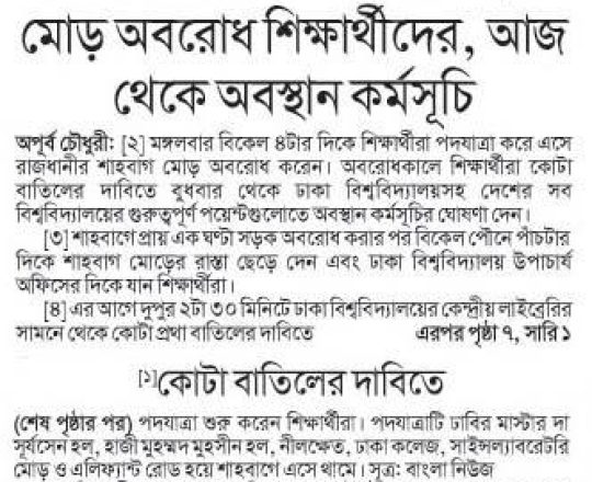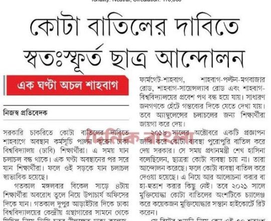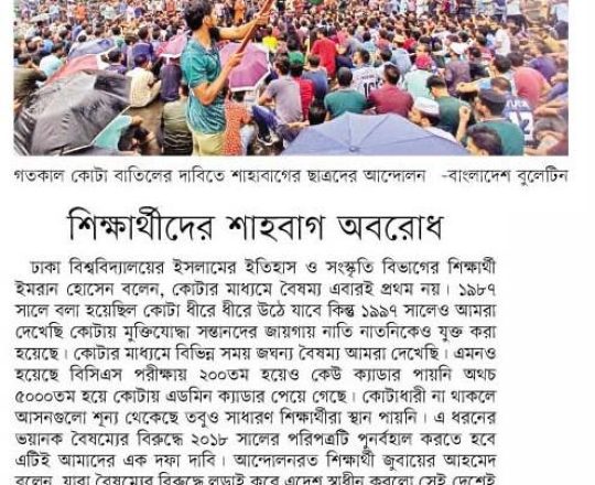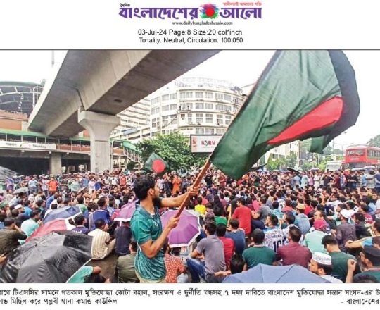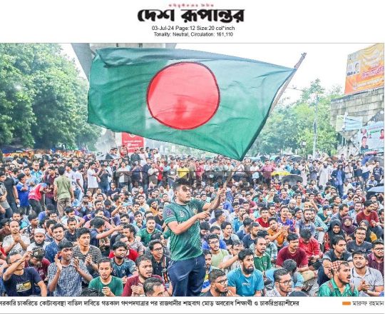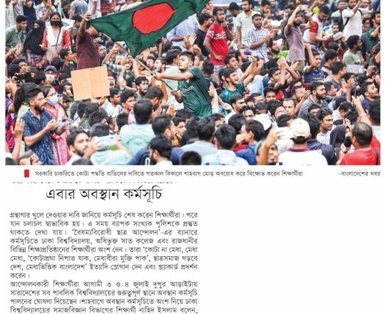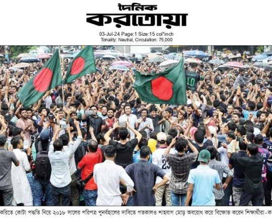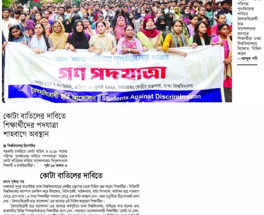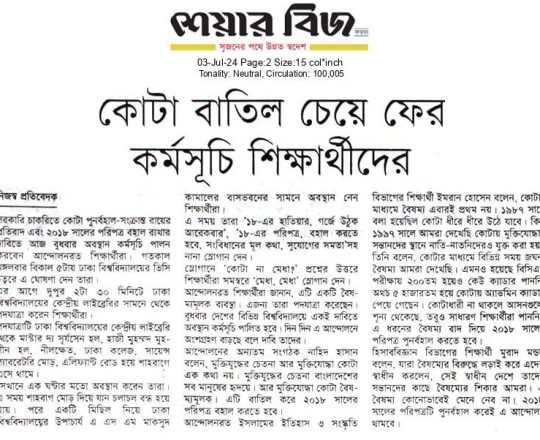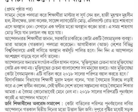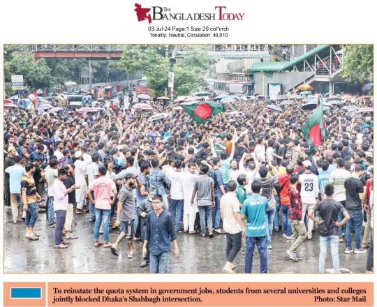 দৈনিক বাংলা, ৩ জুলাই ২০২৪, কোটা বাতিলের দাবিতে স্বতঃস্ফূর্ত ছাত্র আন্দোলন