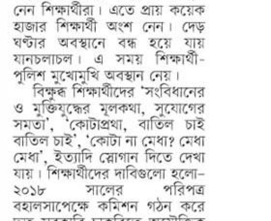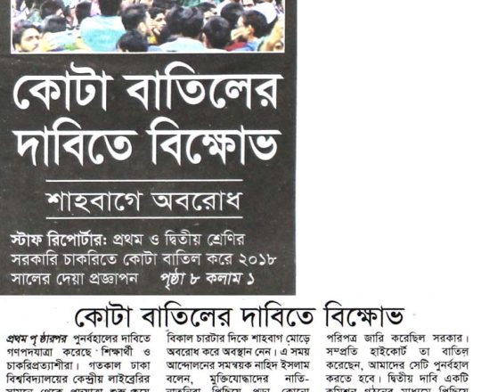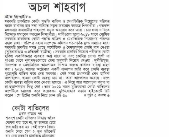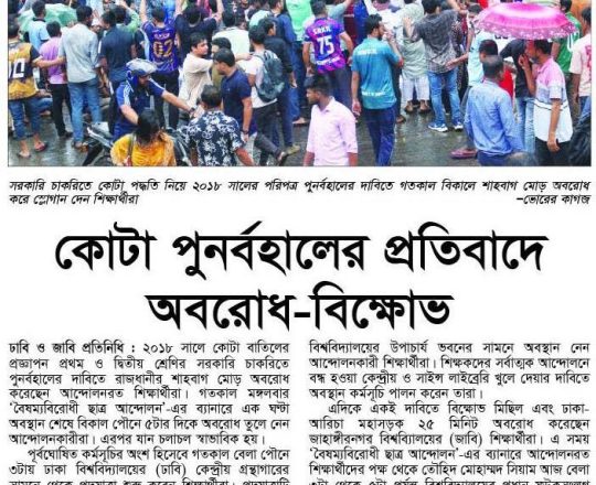 দৈনিক করতোয়া, ৩ জুলাই ২০২৪, সরকারি চাকরিতে কোটা পদ্ধতি নিয়ে ২০১৮ সালের পরিপত্র পুনর্বহালের দাবিতে গতকালও শাহবাগ মোড় অবরোধ করে বিক্ষোভ করেন শিক্ষার্থীরা