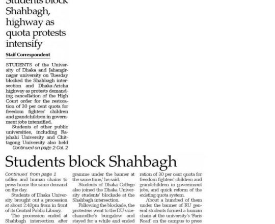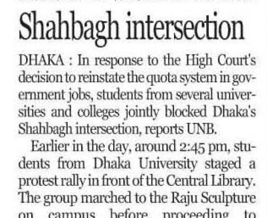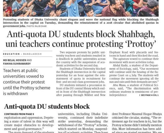 Business Standard, 3 july 2024, Anti-quota DU students block Shahbagh, uni teachers continue protesting 'Prottoy