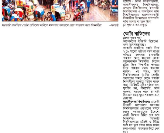দৈনিক জনকণ্ঠ, ৩ জুলাই ২০২৪, কোটা বাতিলের দাবিতে বিভিন্ন ভার্সিটিতে বিক্ষোভঅব্যাহত