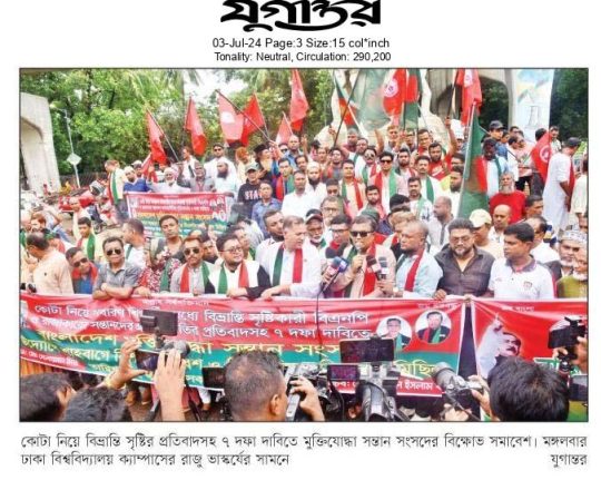 যুগান্তর, ৩ জুলাই ২০২৪, কোটা নিয়ে বিভ্রান্তি সৃষ্টির প্রতিবাদসহ ৭ দফা দাবিতে মুক্তিযোদ্ধা সন্তান সংসদের বিক্ষোভ সমাবেশ