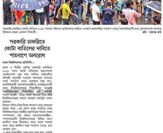 কালের কণ্ঠ, ৩ জুলাই ২০২৪, সরকারি চাকরিতে কোটা বাতিলের দাবিতে শাহবাগে অবরোধ