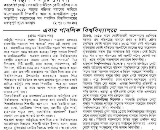 দৈনিক করতোয়া, ৩ জুলাই ২০২৪, কোটা বাতিলের দাবি এবার পাবলিক বিশ্ববিদ্যালয়ে অবস্থান কর্মসূচি ঘোষণা