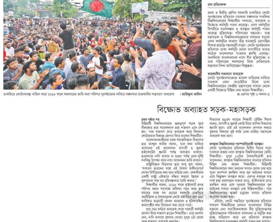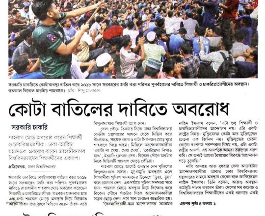 নয়া দিগন্ত, ৩ জুলাই ২০২৪, কোটা বাতিলের দাবিতে বিক্ষোভ, সড়ক অবরোধ