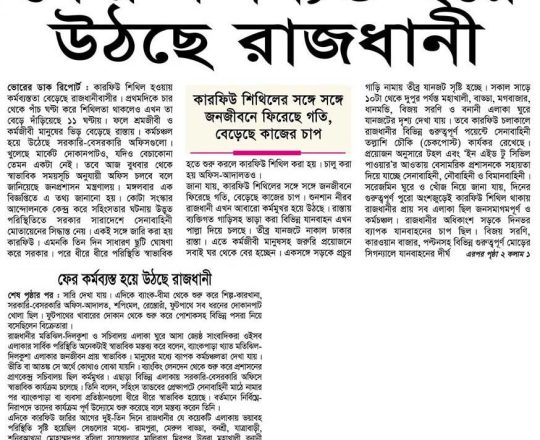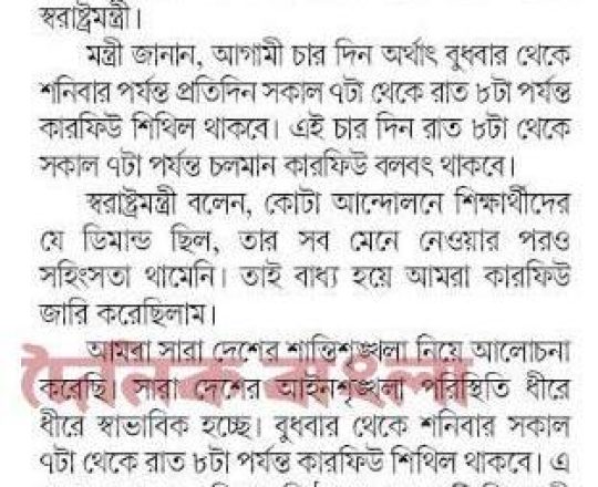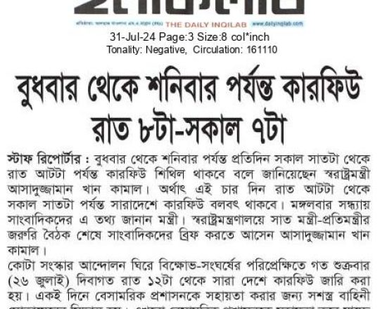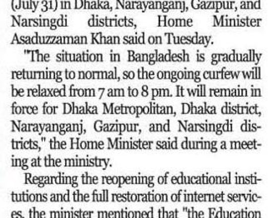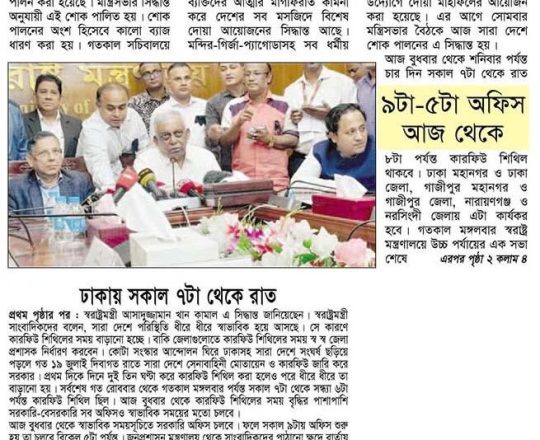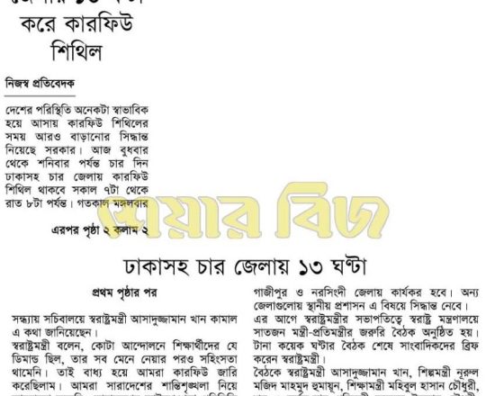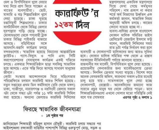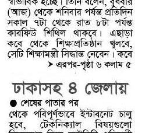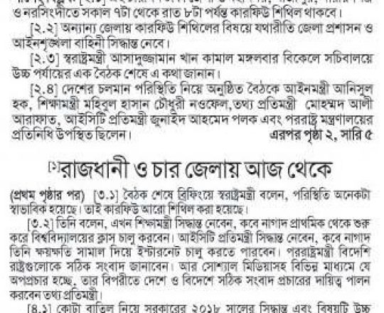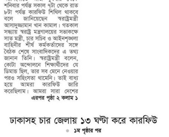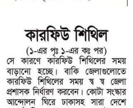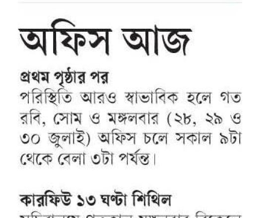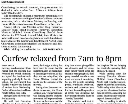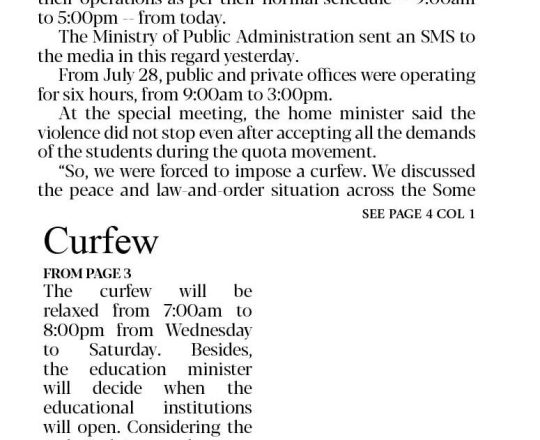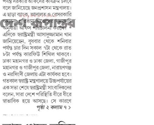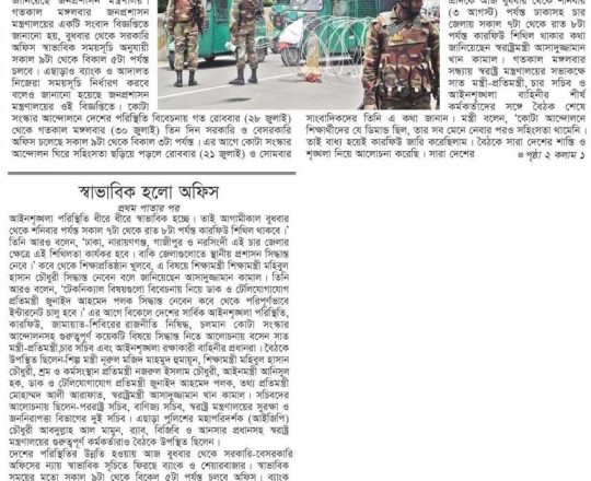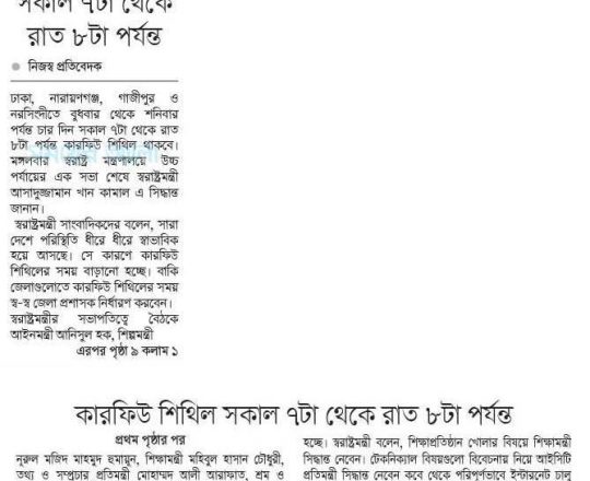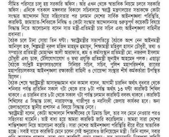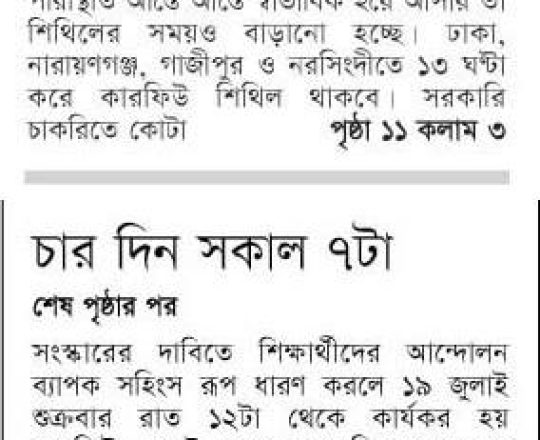 প্রথম আলো,৩১ জুলাই, সকাল ৭টা থেকে রাত ৮টা পর্যন্ত কারফিউ শিথিল