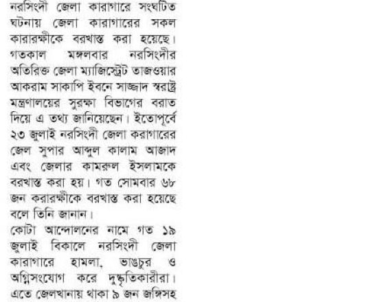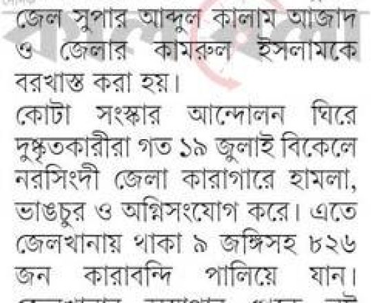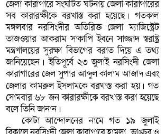 আজকালের খবর, ৩১ জুলাই ২০২৪, নরসিংদী জেলা কারাগারের ৬৮ কারারক্ষীকে বরখাস্ত