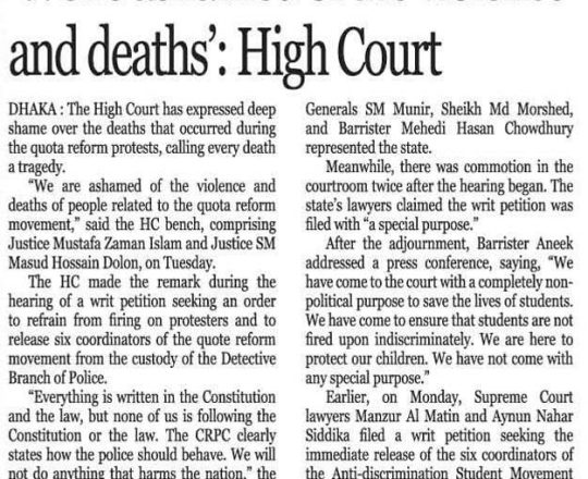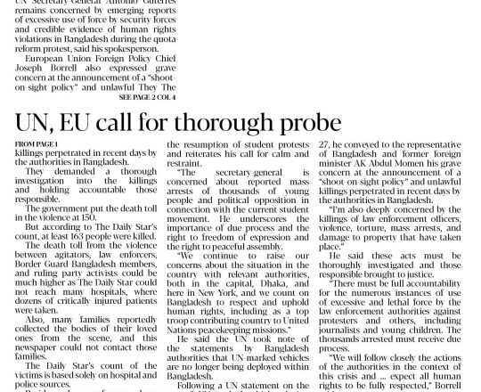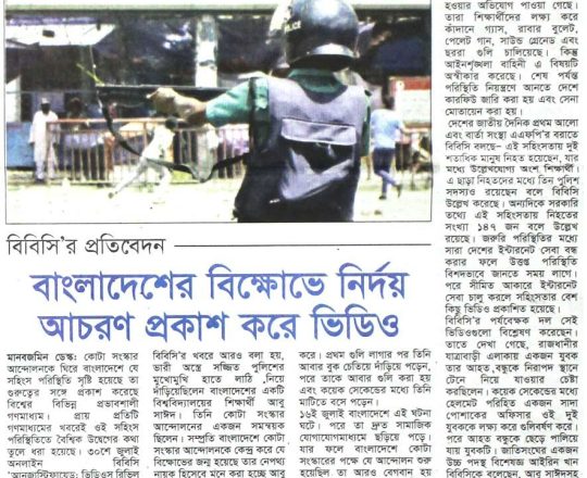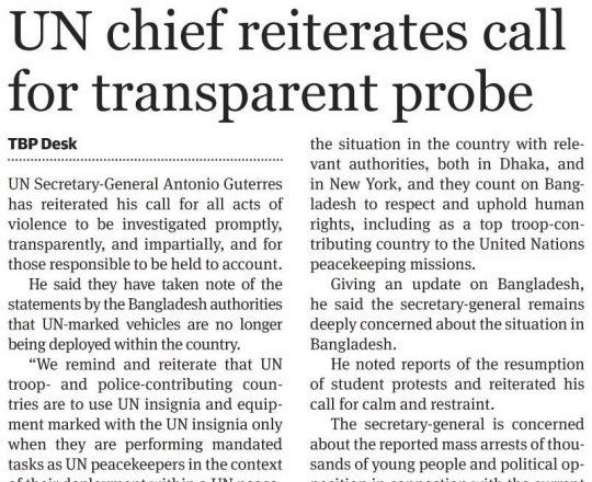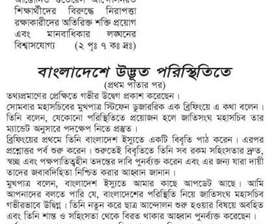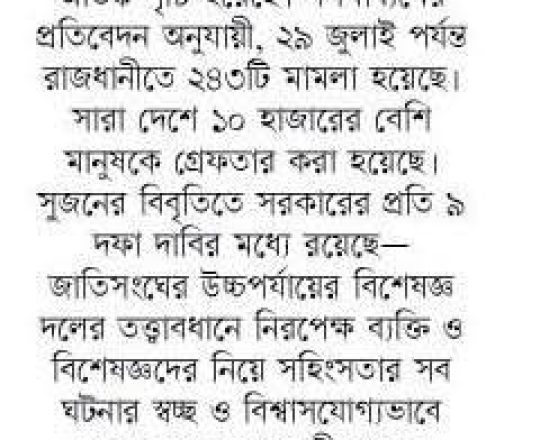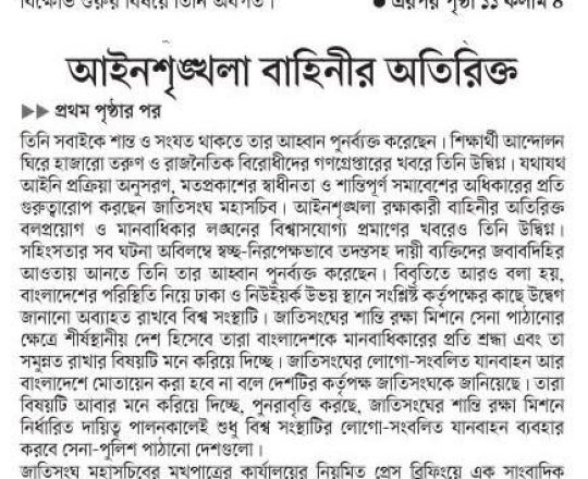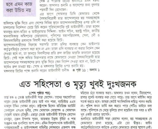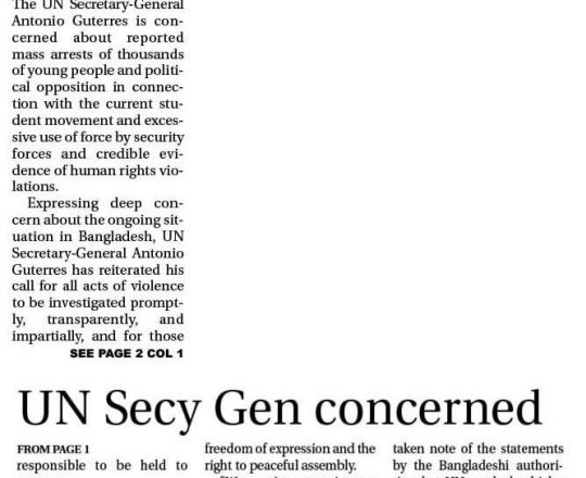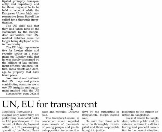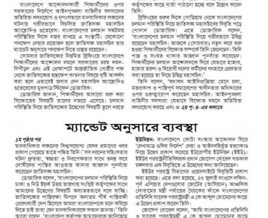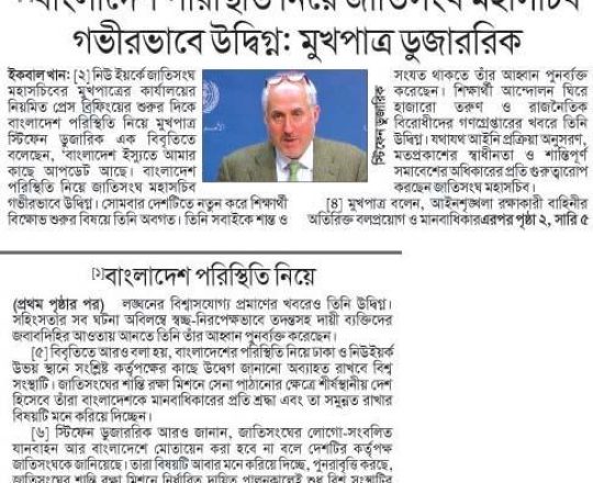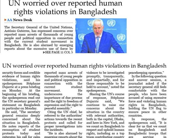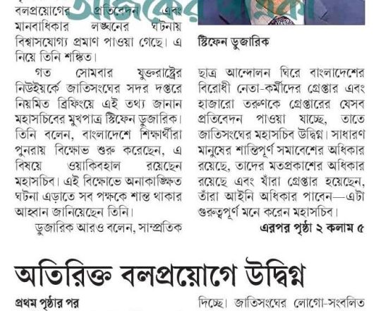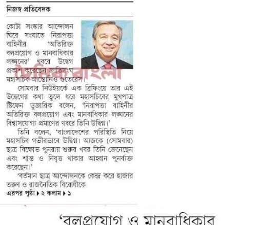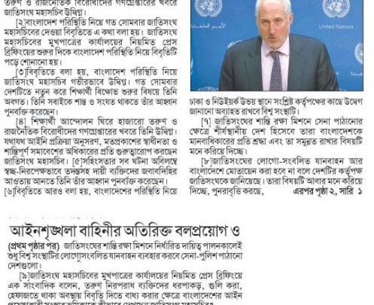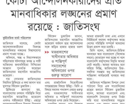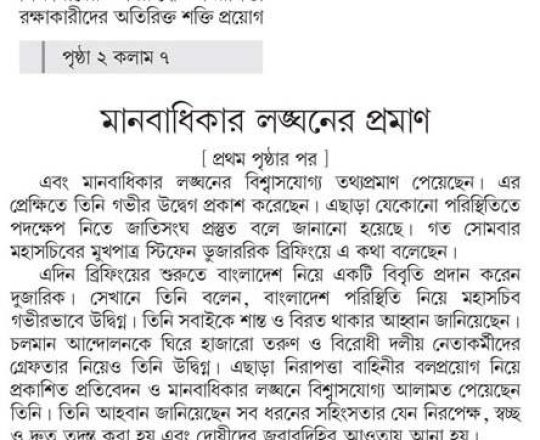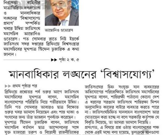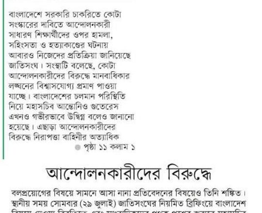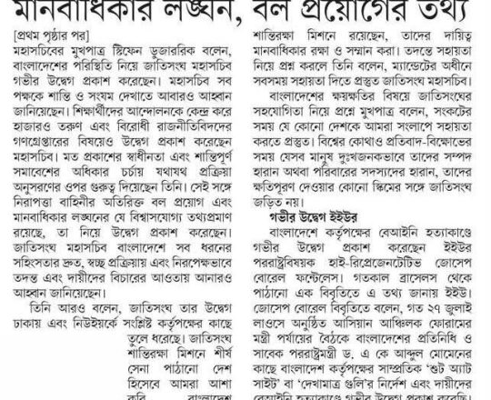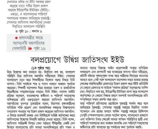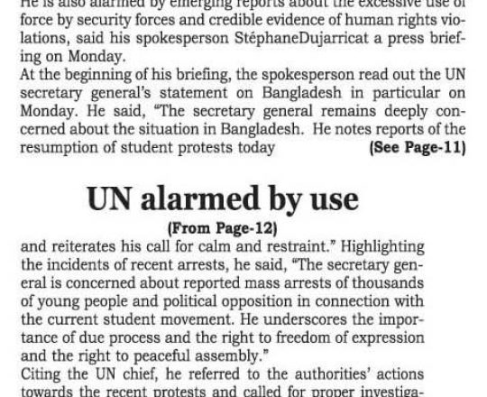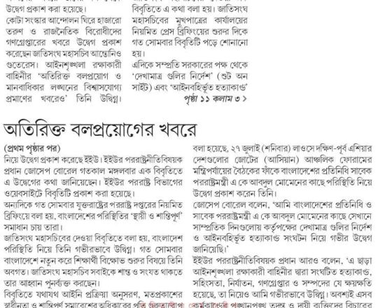 প্রথম আলো,৩১ জুলাই,আইনশৃঙ্খলা বাহিনীর অতিরিক্ত বলপ্রয়োগ ও মানবাধিকার লঙ্ঘনের বিশ্বাসযোগ্য প্রমাণের খবরে উদ্বিগ্ন জাতিসংঘ