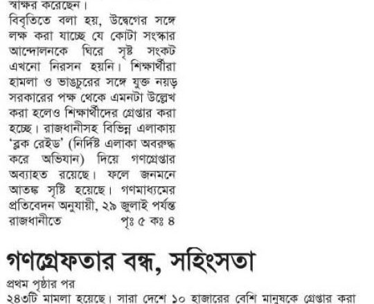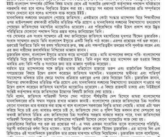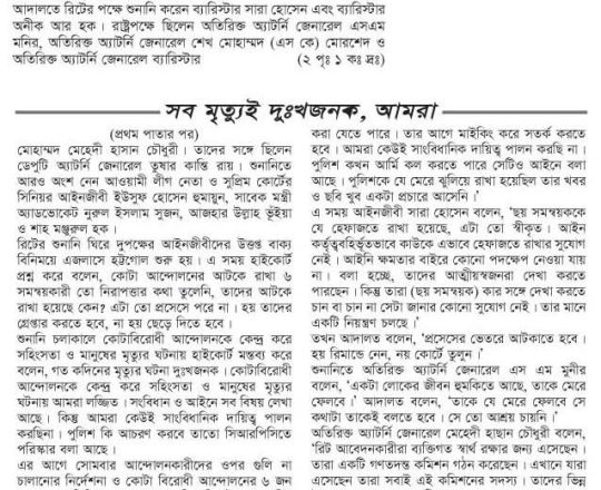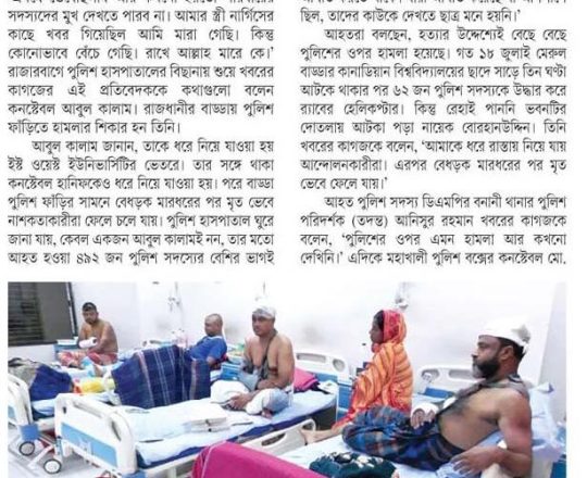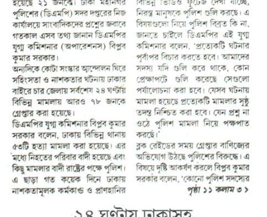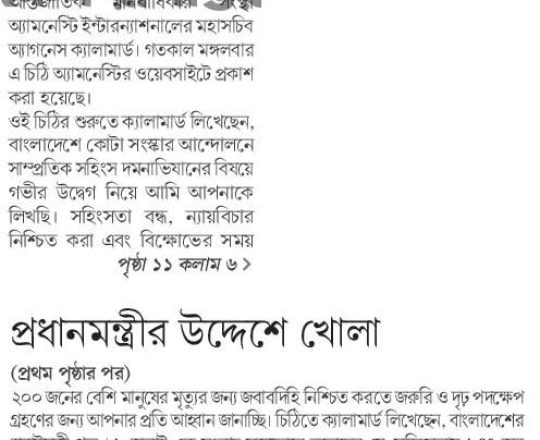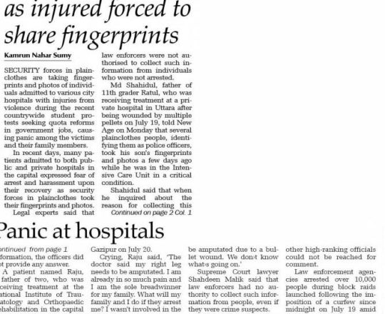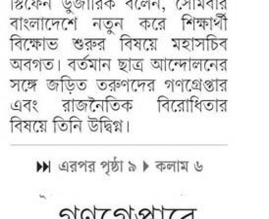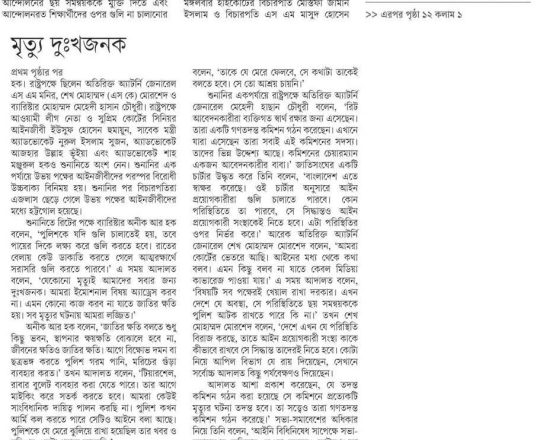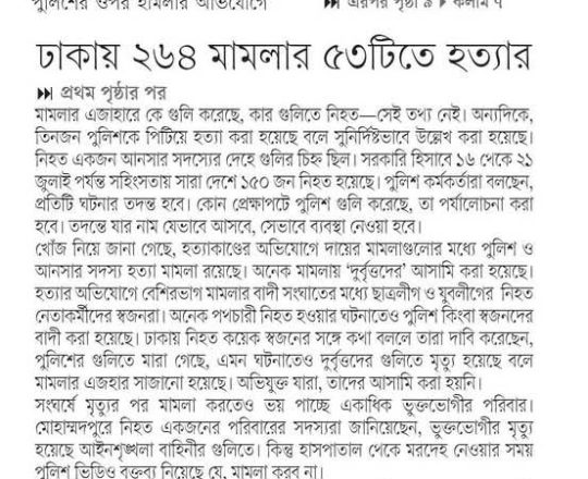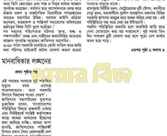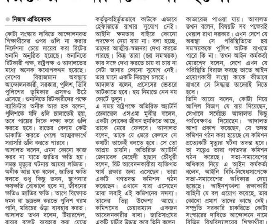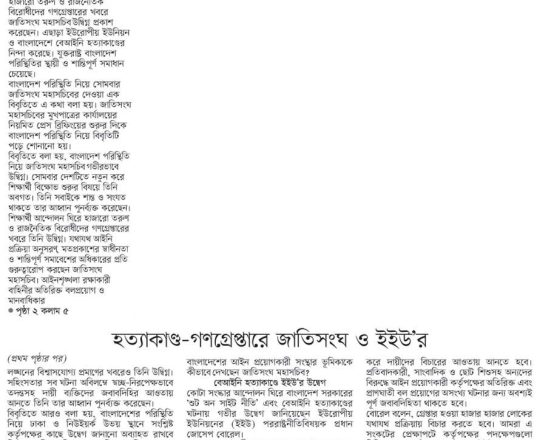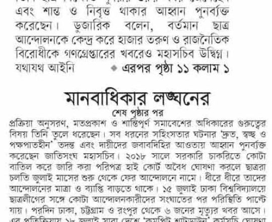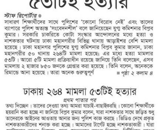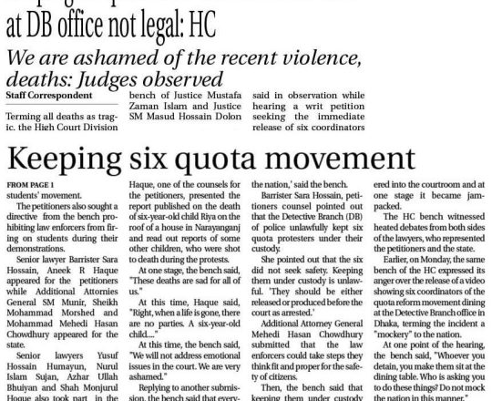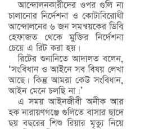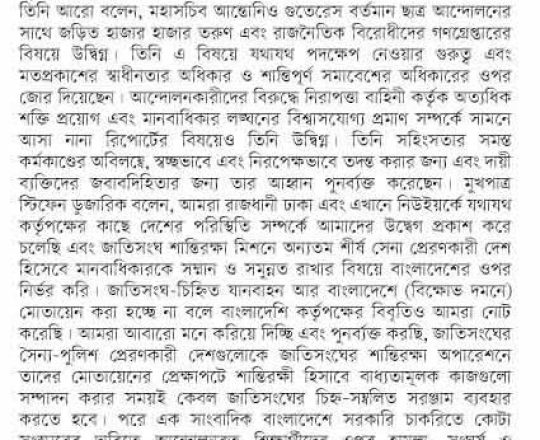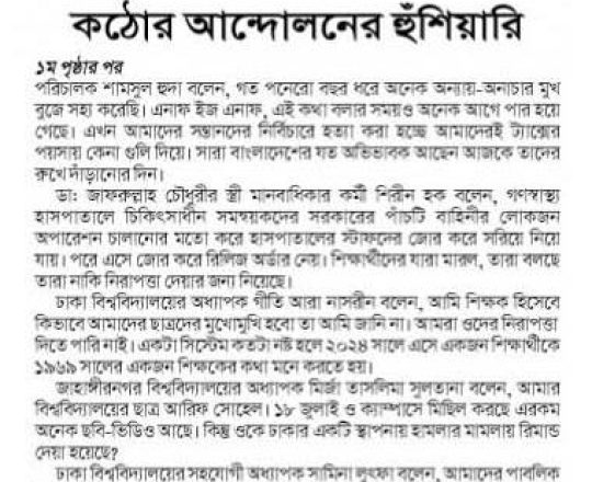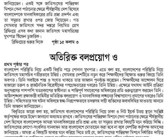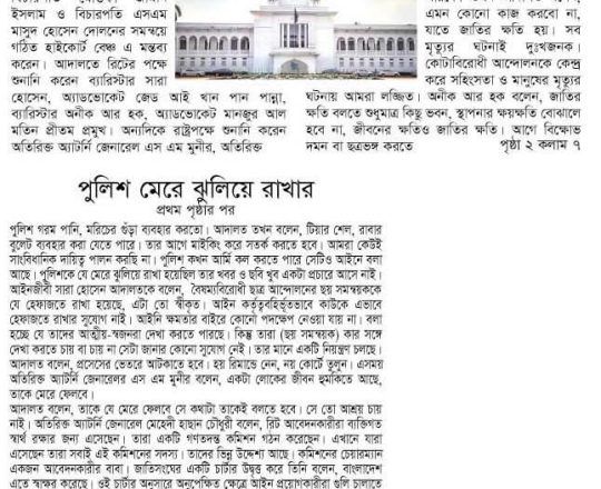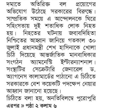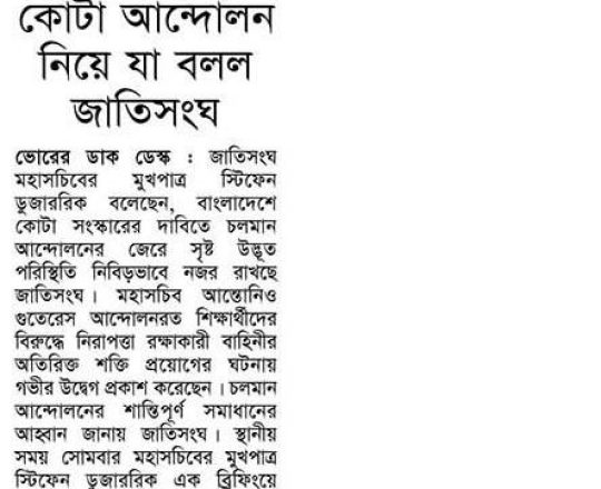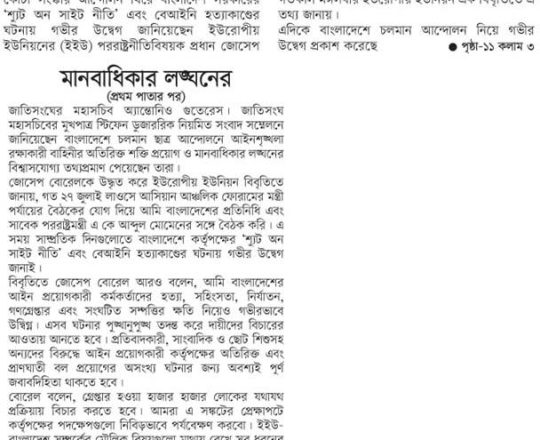 প্রথম আলো,৩১ জুলাই,আইনশৃঙ্খলা বাহিনীর অতিরিক্ত বলপ্রয়োগ ও মানবাধিকার লঙ্ঘনের বিশ্বাসযোগ্য প্রমাণের খবরে উদ্বিগ্ন জাতিসংঘ