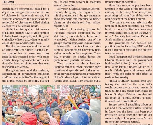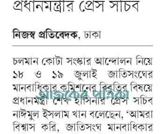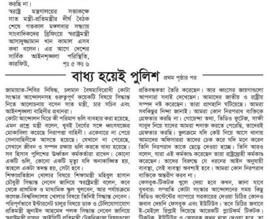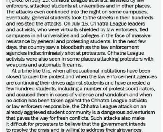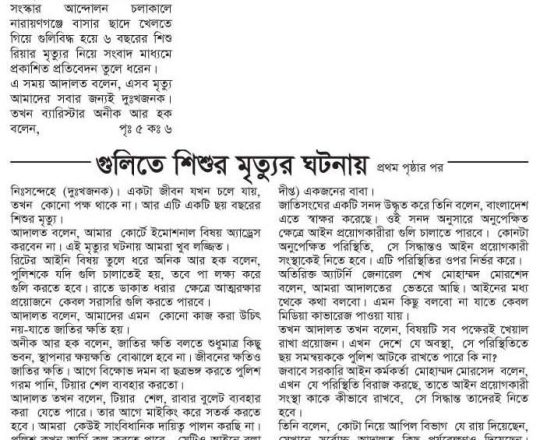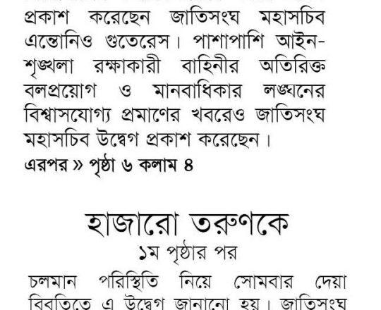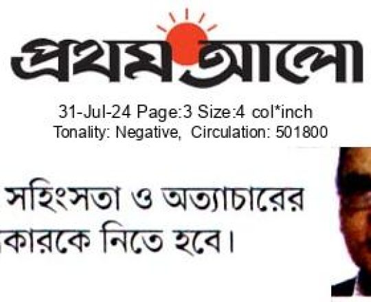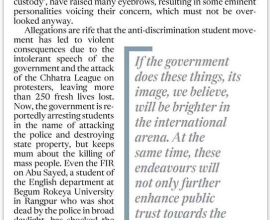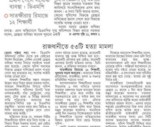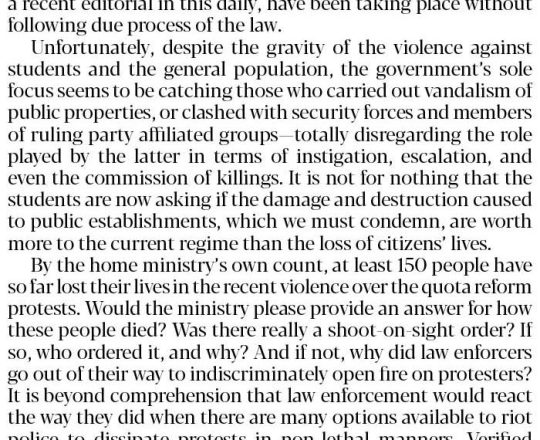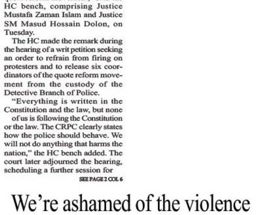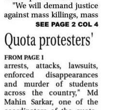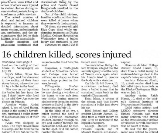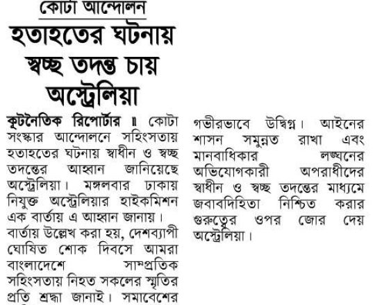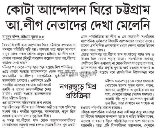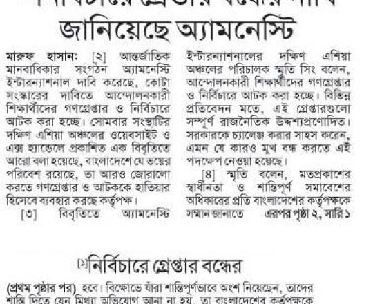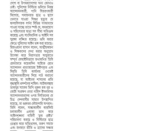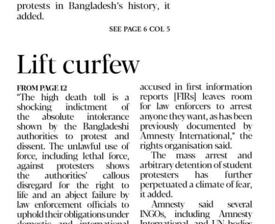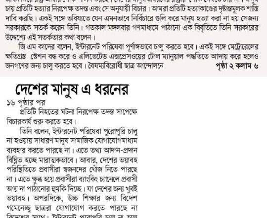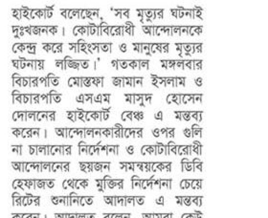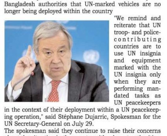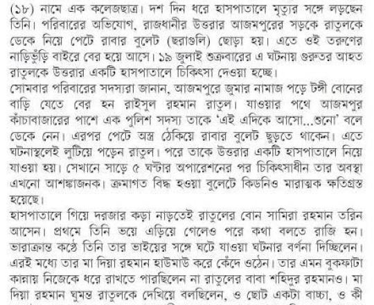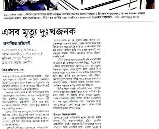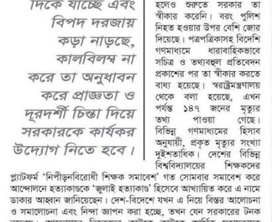 প্রথম আলো,৩১ জুলাই,আইনশৃঙ্খলা বাহিনীর অতিরিক্ত বলপ্রয়োগ ও মানবাধিকার লঙ্ঘনের বিশ্বাসযোগ্য প্রমাণের খবরে উদ্বিগ্ন জাতিসংঘ